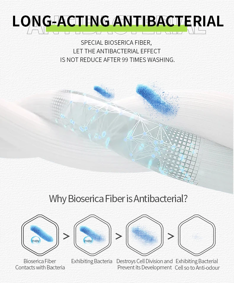 Product Ingredients | Bioserica Antibacterial fiber 16.7% Cotton 45.4% Polyester fiber 34.2% Nylon 3.7% |