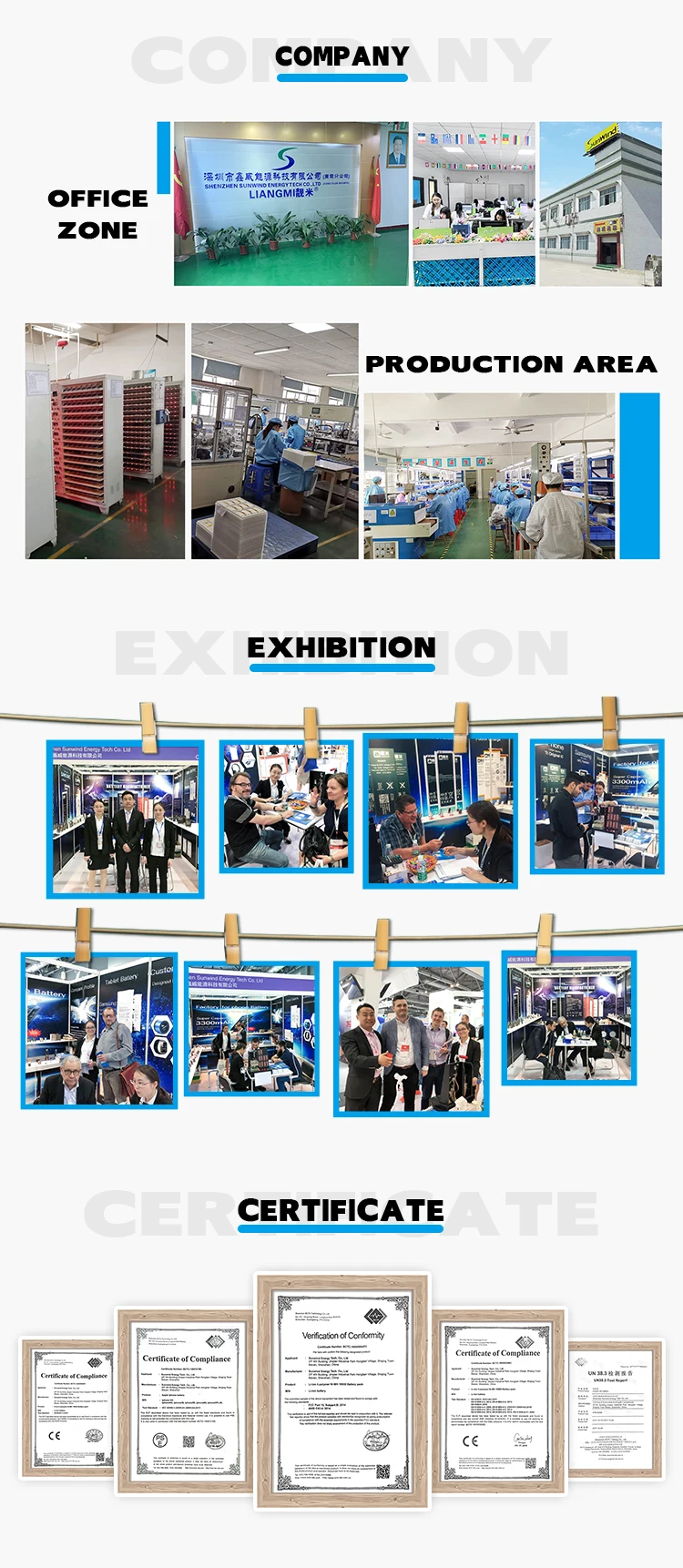 Shenzhen Sunwind Energy Tech Co., Ltd is one of the professional battery manufacturer in China, which commits to the battery production,sales and after-sales service. we have professional battery decoding team technology with over 10 years experience,meanwhile we established our own brand LIANGMI. Our main products are Mobile phone battery, Digital batteries, PC tablet batteries, Watch battery, POS Terminal batteries, Scanner batteries,Toy batteries and Customized battery packs.