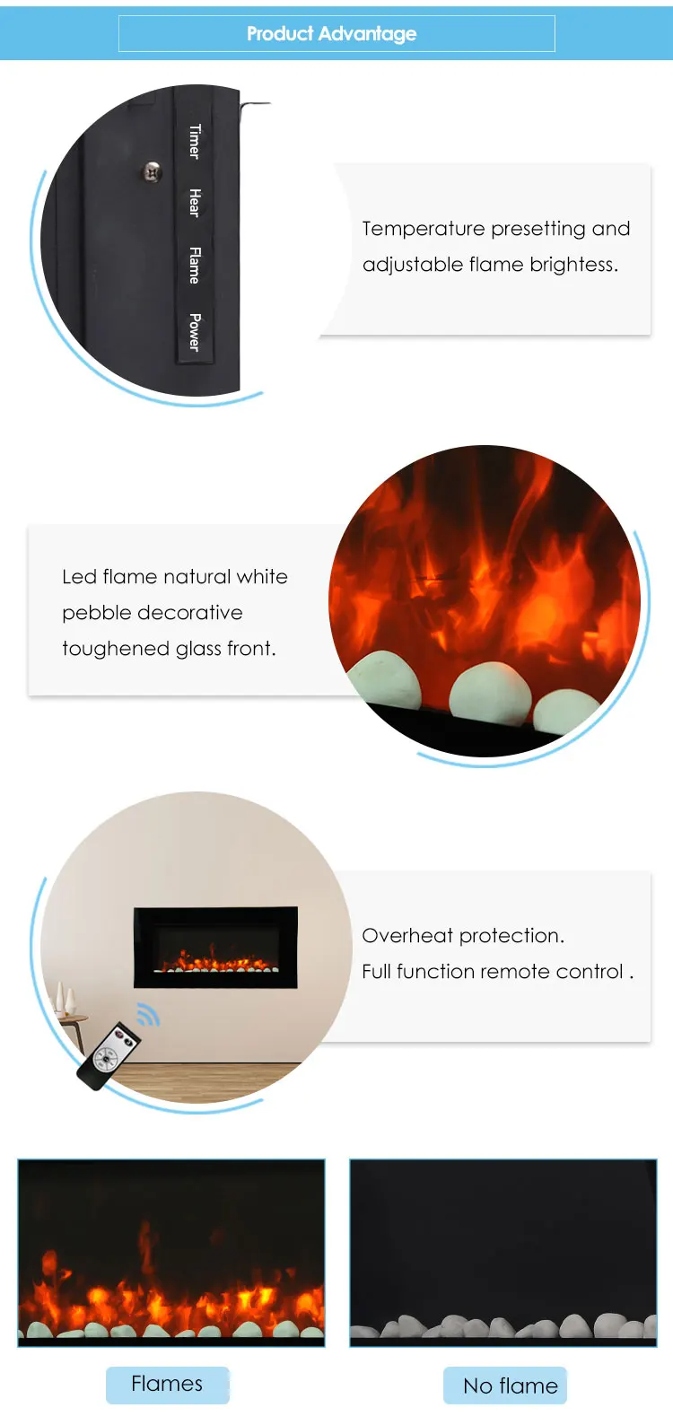 Voltage | 220~240V50Hz/ 120V/60Hz | Flame | 7 flame color adjustable with LED light |