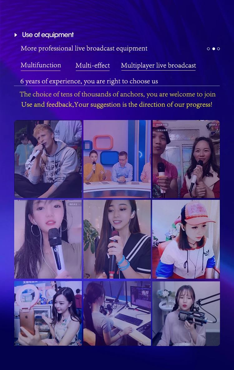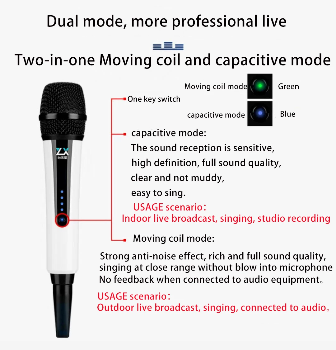 2,K15 wireless microphone button switching mode: The moving coil mode is suitable for outdoor connected speakers, Capacitance mode is suitable for indoor live streaming |