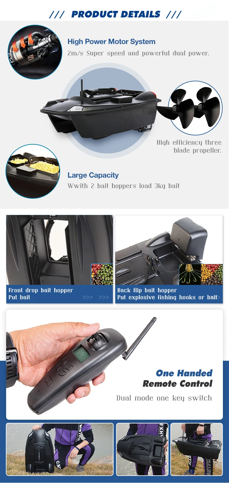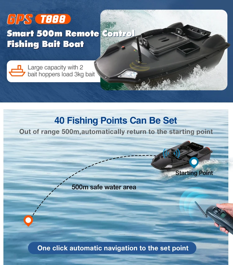 1. Boat body adopts high quality ABS material to inject molding, more stable and firm which can againt the stong wind and wave; 2. Double motors, huge loading Two separate bait tanks which can be controlled separately.Super large capacity baits tank,weight is 2.85kg;