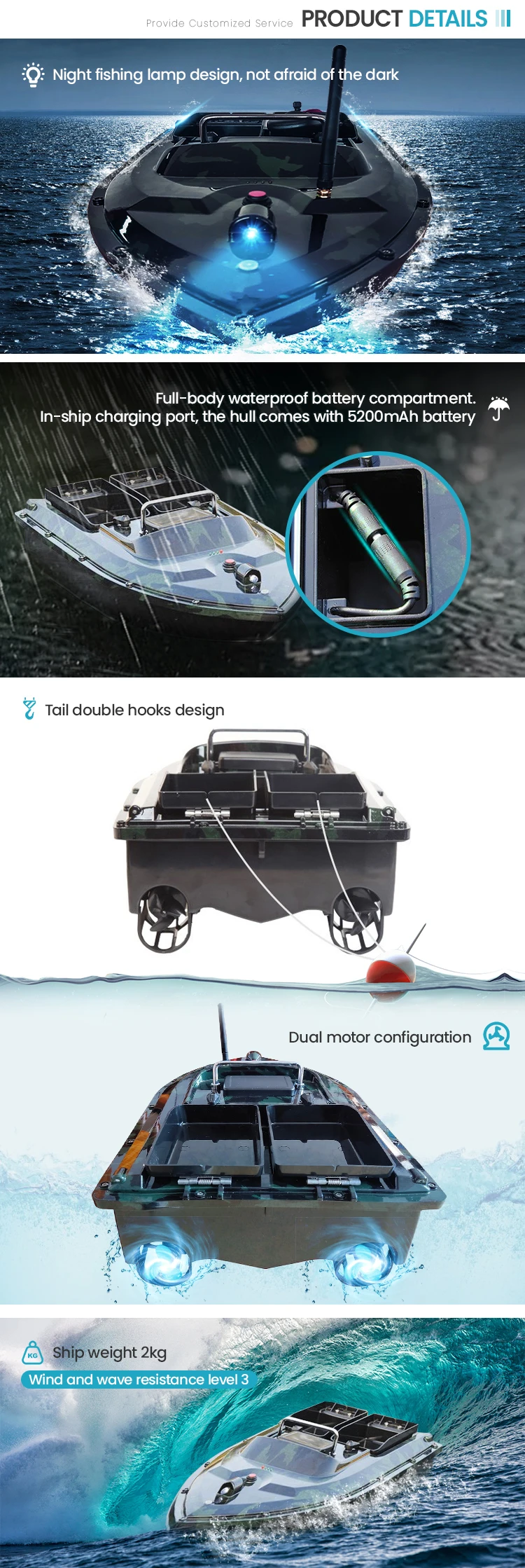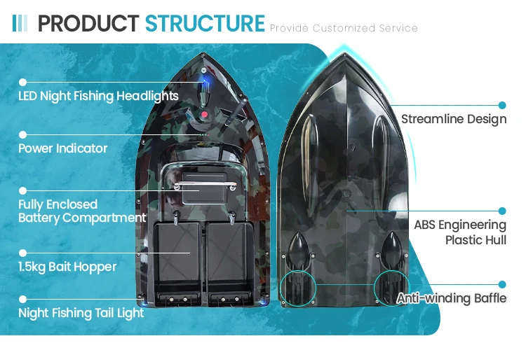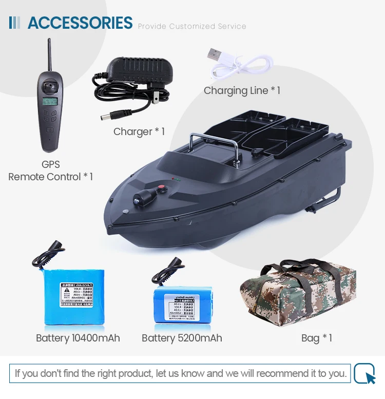 1. Boat body adopts high quality ABS material to inject molding, more stable and firm which can againt the stong wind and wave; 2. Double motors, huge loading Two separate bait tanks which can be controlled separately.Super large capacity baits tank,weight is 2.85kg;