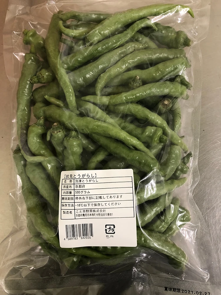 Frozen "Manganji" Chili Pepper-Whole. Length is about 20cm, and thickness about 3 to 5 cm dia. This "Manganji(万願寺)" chilli pepper is one of the most popular "Kyo-Yasai" and has very large and thick body. It has less seeds and no capsaicin, thus much sweeter, and called " King of Chilli Peppers ". Good source of Vitamin C. The best is grilled. Also great to be pan-fried, Tenpura, etc. Its bright green color will surely stimulate the dinners' apetite.