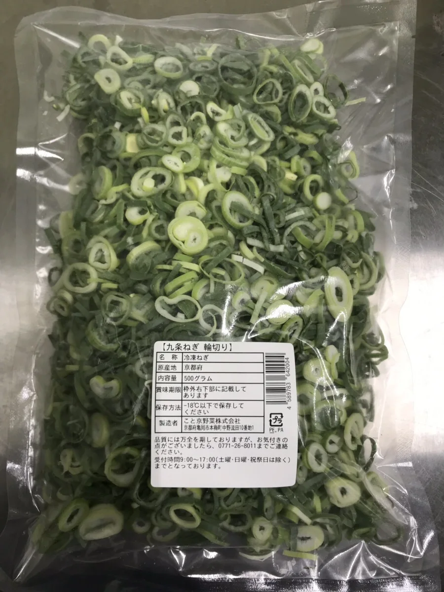 Kyoto is the ancient capital of Japan and the home of the state-of-art Japanese cuisine. " Kyo-Yasai (京野菜) " means branded Kyoto native vegetables, the premium-quality native vegetables farmed and developed in Kyoto for over 1200 years through. This branded spring onion ""Kujo" Negi as one of Kyo-Yasai grows taller than other Japanese spring onions and has more dark-green parts and thicker body which has rich slimy inner skin that carries sweet flavor and nutrients. This innovative Agricultural Corporation, Koto Kyoto Co., Ltd., has applied special pretreatment and rapid freezing method to this "Kujo" Negi to produce Japan's best-selling frozen "Kujo" Negi, "Koto-Kujo-Negi" Series. There are three differently sliced types for different dishes. Round-sliced, Diagonally-sliced and Stick-cut types.