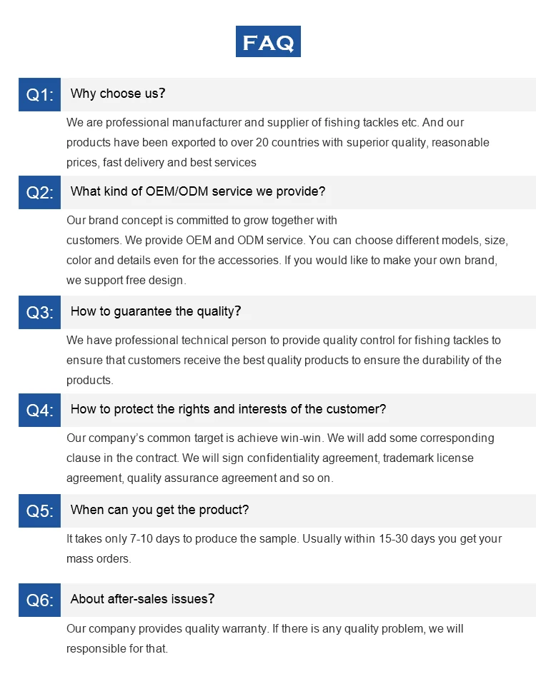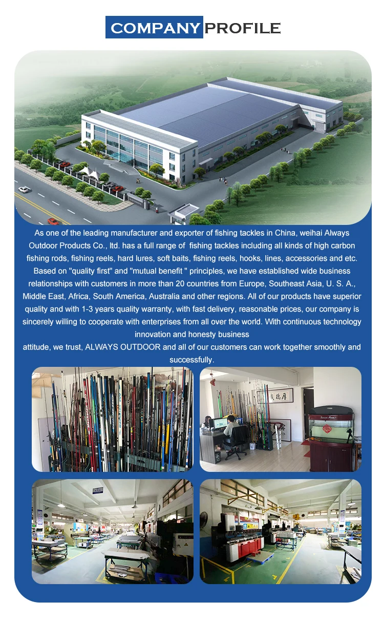 As one of the leading manufacturer and exporter of fishing tackles in China, weihai Always Outdoor Products Co., ltd. has a full range of fishing tackles including all kinds of high carbon fishing rods, fishing reels, hard lures, soft baits, fishing reels, hooks, lines, accessories and etc. Based on "quality first" and "mutual benefit " principles, we have established wide business relationships with customers in more than 20 countries from Europe, Southeast Asia, U. S. A., Middle East, Africa, South America, Australia and other regions. All of our products have superior quality and with 1-3 years quality warranty, with fast delivery, reasonable prices, our company is sincerely willing to cooperate with enterprises from all over the world. With continuous technology innovation and honesty business attitude, we trust, ALWAYS OUTDOOR and all of our customers can work together smoothly and successfully.