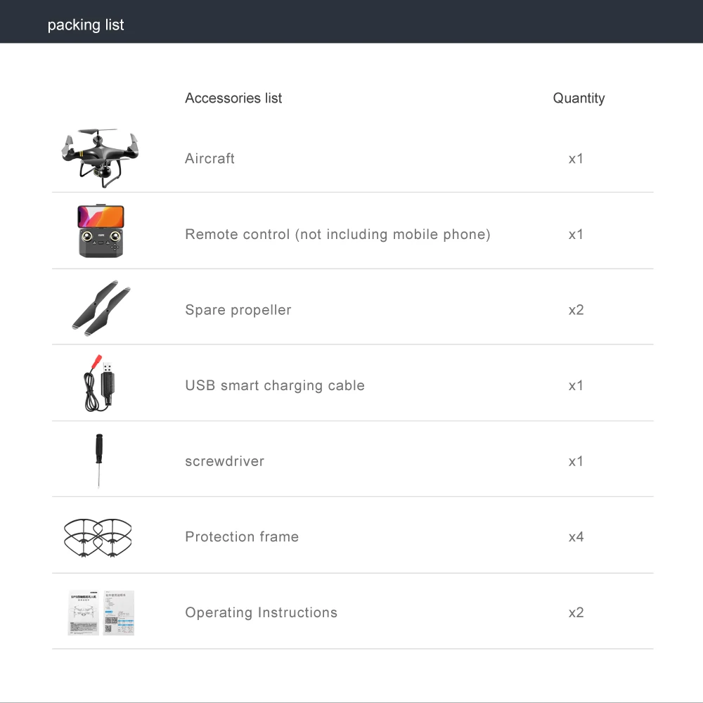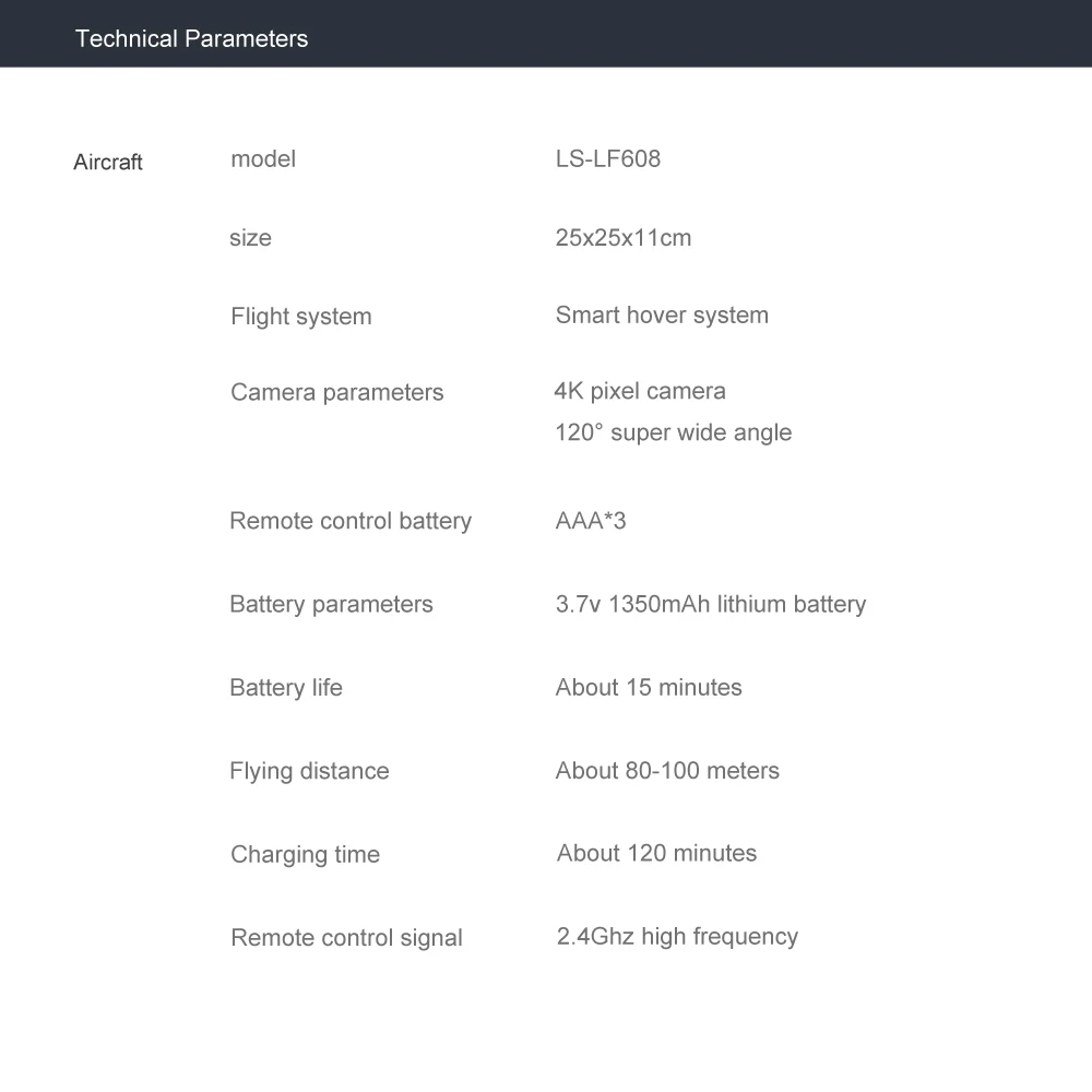 Packing List | 1 x LF608 Drone 1 x Remote Control 1 x 3.7V 1350MAH Battery 1 x USB Charging Cable 2 x Spare Blade 4 x Protection Cover 1 x Phone Holder 1 x Screwdriver |