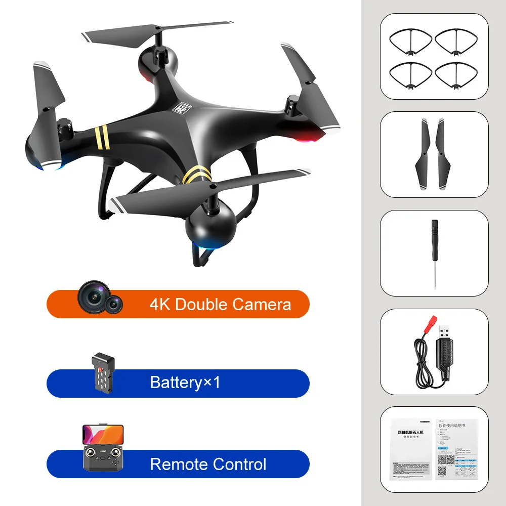 Features | - With altitude hold mode function, flight is stable. - In headless mode, there is no need to adjust the position of the aircraft before flying. - One Key Take-off/Landing/Return. Easily find your way home using the one-button back function. - Built-in 4K pixel HD camera. Surprisingly, it can capture stunning pictures and videos from the sky. - Dual camera switch, get rid of fixed angle of view. - With WiFi function, it can be connected to applications, APK system, and take photos, videos, and real-time transmission through mobile phone camera images. - Draw a flight path on the screen, the drone will fly autonomously along the specified path. - VR 3D experience. Through mobile app with VR glasses, you can feel the emptiness from the perspective. - MV production, music addition. - 3.7V 1350mAh modular battery, easy to install and take, battery life up to 15 minutes. - 2.4GHz anti-interference technology. - 4 channels for ascent, descent, forward, backward, left flight, right flight and 360°roll. - Six-axis gyroscope, smoother flight and more convenient control. - LED lights make flying more spectacular, especially in the dark. |