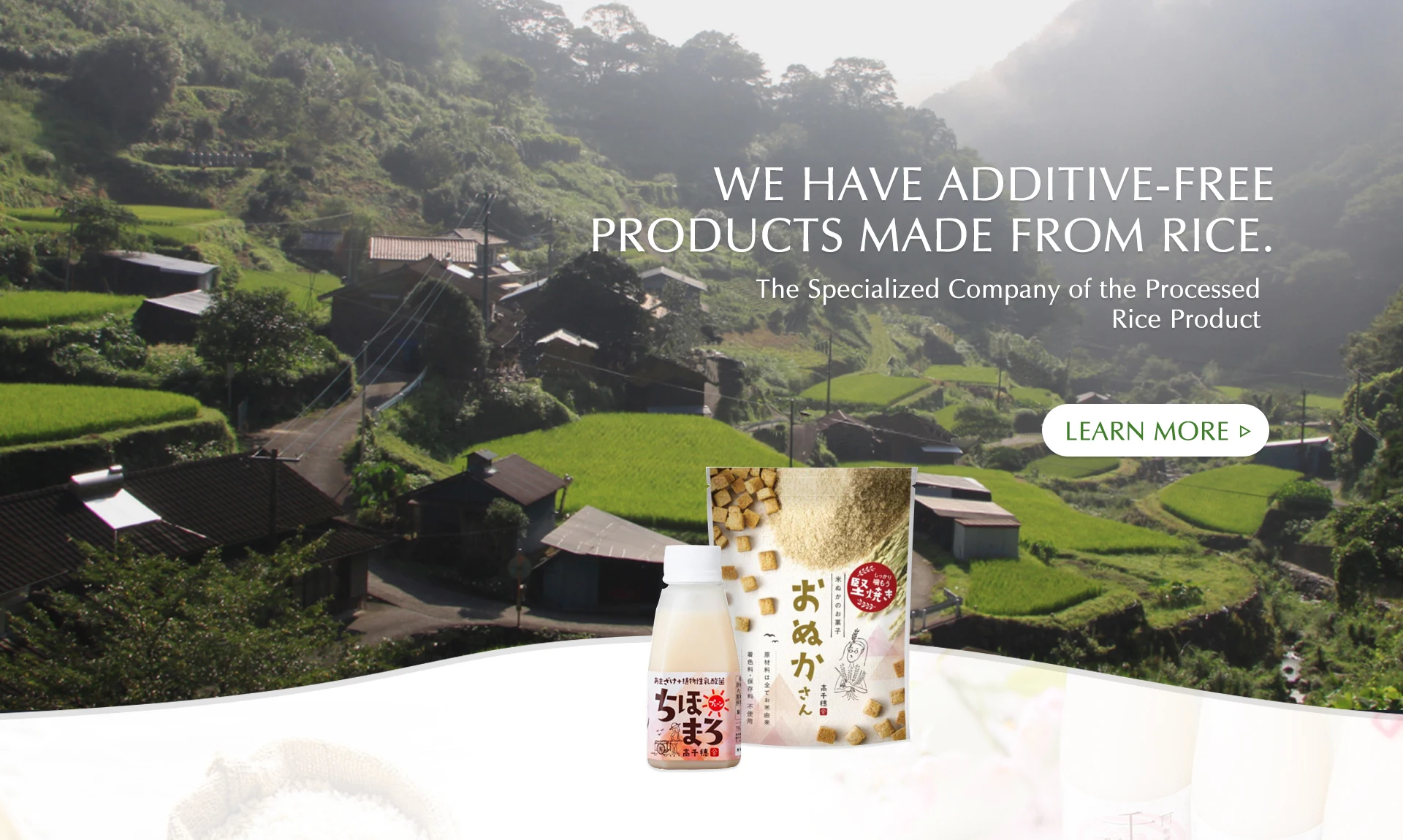 We manufacture rice-based products such as amazake, doburoku, and rice bran snacks.