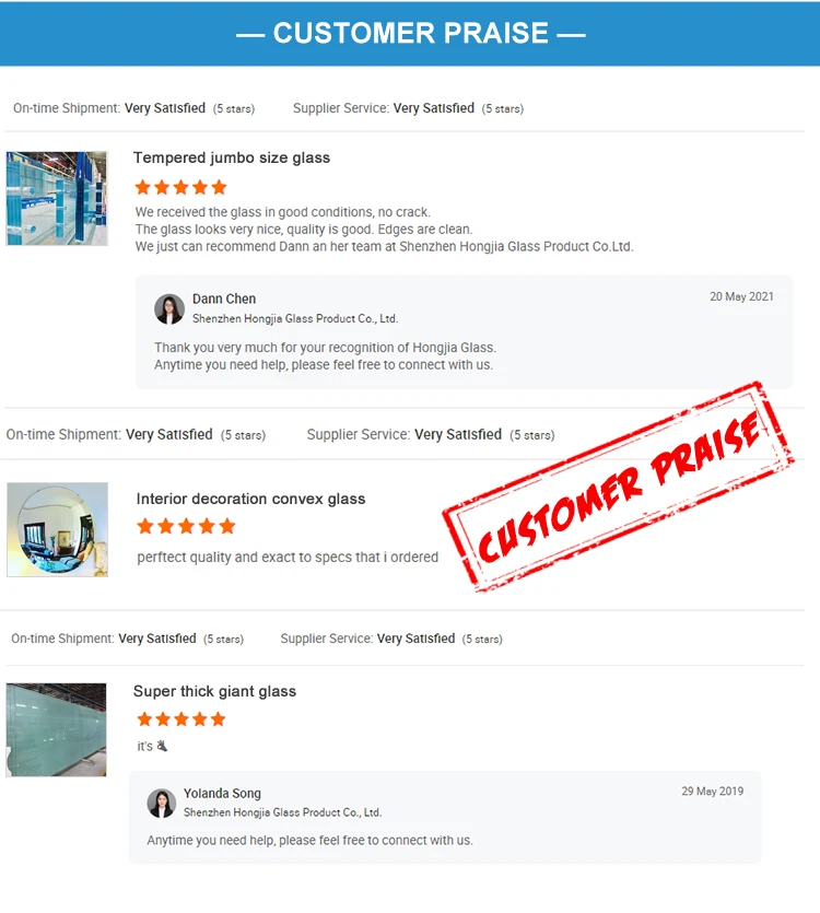 Hongjia Glass is located in Shenzhen city, China, which is a producer and a global distributor of high-end glass products for a range of purposes from 2005.We specialized in architecture and decoratvie glass. Whether you're looking for glass products for an exterior building or need high quality, customized products for interior designs, Hongjia Glass is here for you. With excellent connections and access to a large number of factories, our main port is Shenzhen and Shanghai. Not only we can produce high quality goods meet client's requirments but also can deliver goods on time within the budget.