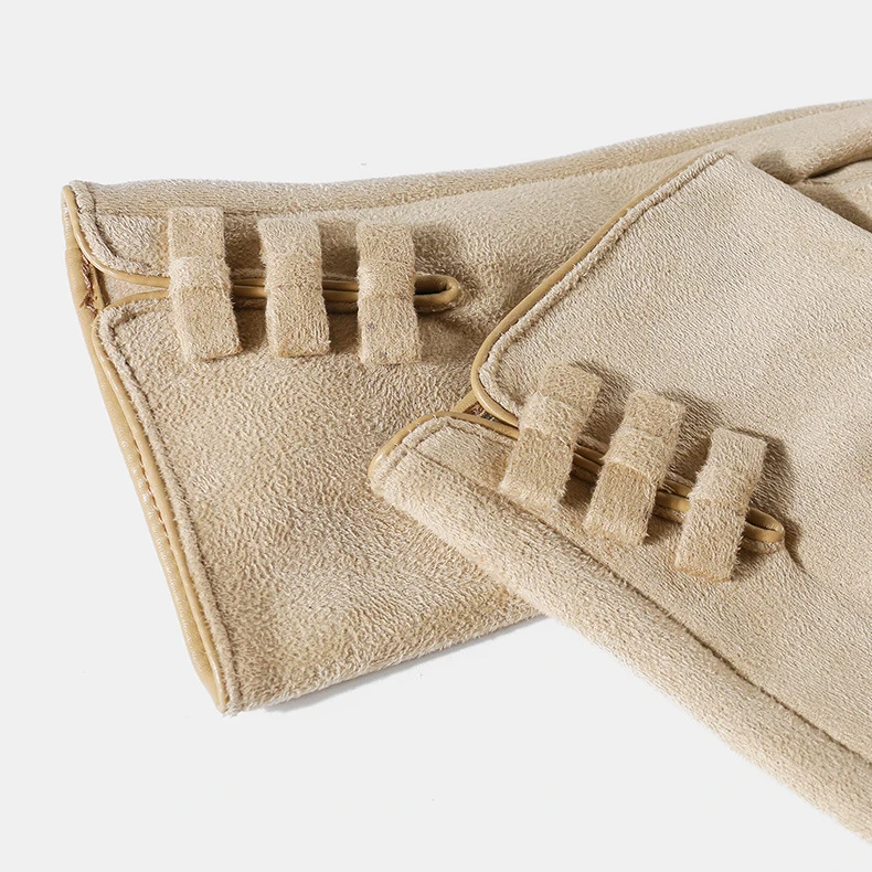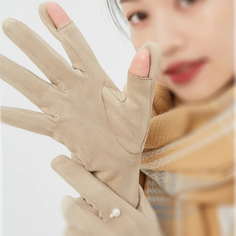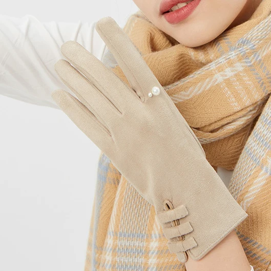 Fashion Pearl Solid Full Finger Suede Gloves Outdoor Touch Screen Mitten Winter Warm for