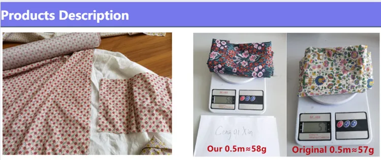 Our secret is to make color separation drawing, the pattern fineness can reach more than 91%. Although manual tracing is expensive, the color separation must be done if the color separation is possible. Of course, some patterns can only be scanned digitally. The similarity of the scan is around 85%. The big rolls are made, and the small pieces are the same. | We choose a 100s cotton base fabric for digital printing. The density is 133*100, which is close to the original. The feel and thickness are similar. Our half-meter is about 58g, and the original half-meter is about 57g. You can choose to buy rice samples to see the quality. |