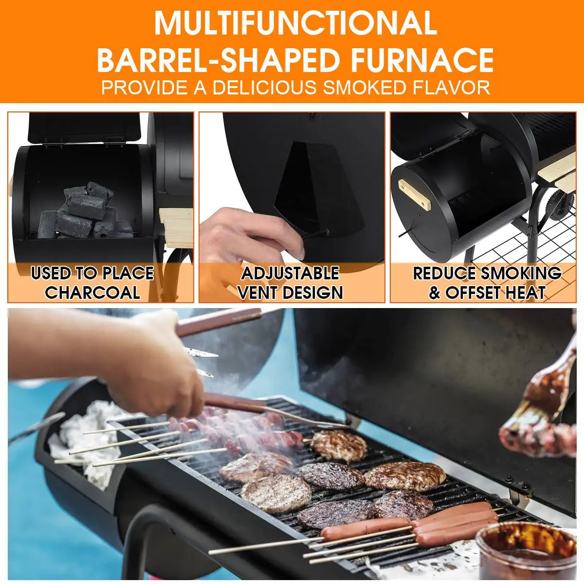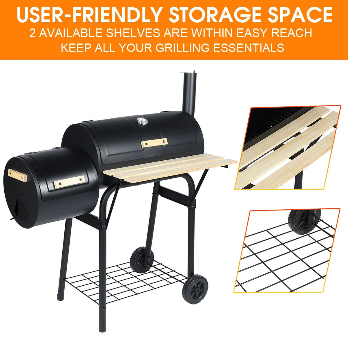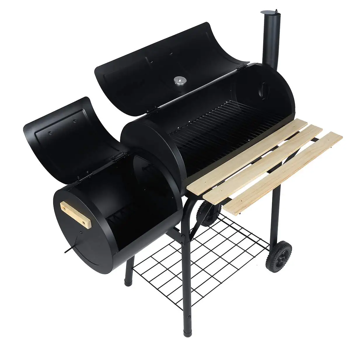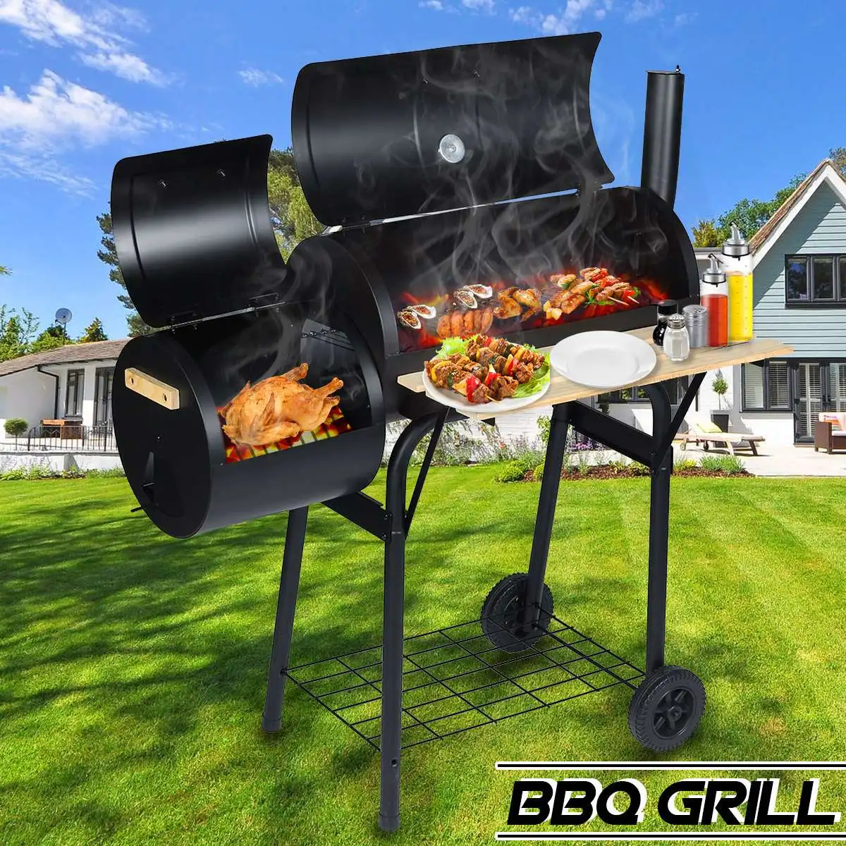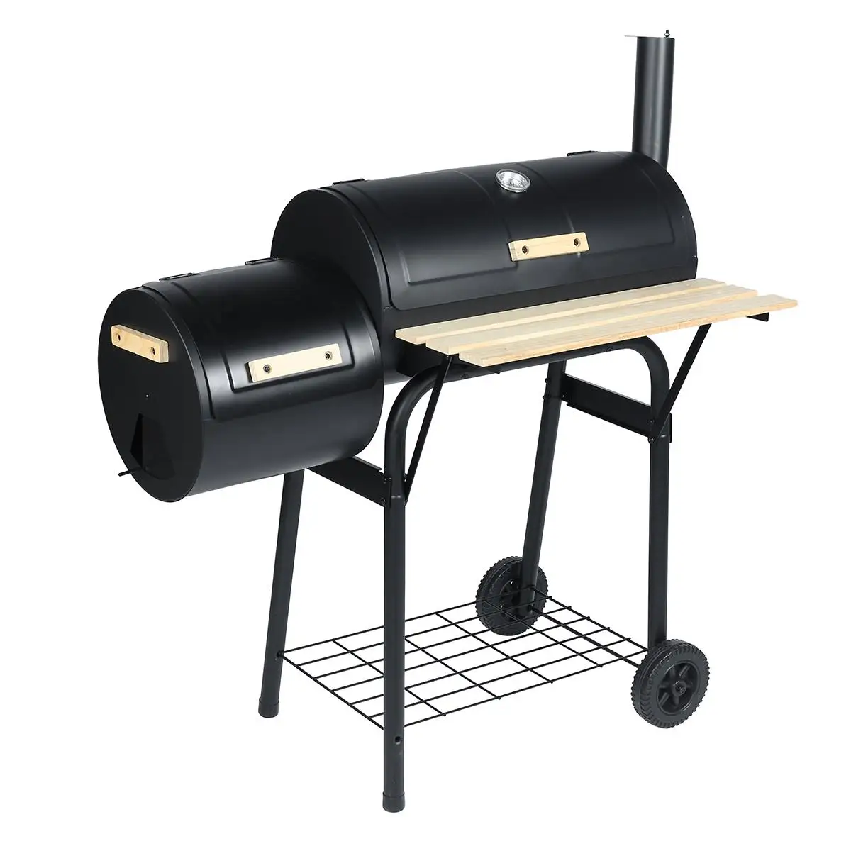 Outdoor BBQ Grill Charcoal Barbecue Pit Patio Backyard Meat Cooker Smoker Features: - Ideal for outdoor use. - Durable steel and anti-rust. - Heavy-duty and solid construction. - It has wheels on the bottom to help transport when needed. - The attached steel firebox helps reduce smoking and offset heat for a more comfortable cooking environment. - This unit is the practical and fashionable grill that will help you enjoy outdoor cooking with family and friends. - The backyard charcoal grill has a sleek and stylish black design that will look impressive during use and match most outdoor decors. - This patio charcoal grill is made of durable steel that's anti-rust and will provide years of dependable use.It features a side shelf that can hold food and tools for added convenience. - Traditional charcoal grill with offset smoker combination for dual style barbecue. The offset smoker can also be used as a small grill. Please fuel it using lump charcoal or briquet, with a small amount of wood chips added to help increase flavor. - Includes smoke stack, temperature gauge, scald-proof handle, seamless connection, access door on side to tend charcoal, side air vent, and wheels to transport. New black coating process withstands temperature up to 400℃ and will not peel off easily. Specification: Colore: Black Material: Wood + Stainless Steel Wooden Shelf Area: 62.2 x 19 cm/24.5" x 7.5" Overall Dimension: 115.5 x 64.8 x 108 cm/45.5" x 25.5" x 42.5" Package Included: 1 x Outdoor BBQ Grill Notes: 1.Manual measuring, please allow 1 ~ 3 cm error,thank you. 2.Due to the difference between different monitors, the picture may not reflect the actual color of the item. We guarantee the style is the same as shown in the pictures.Please understand, thank you! |