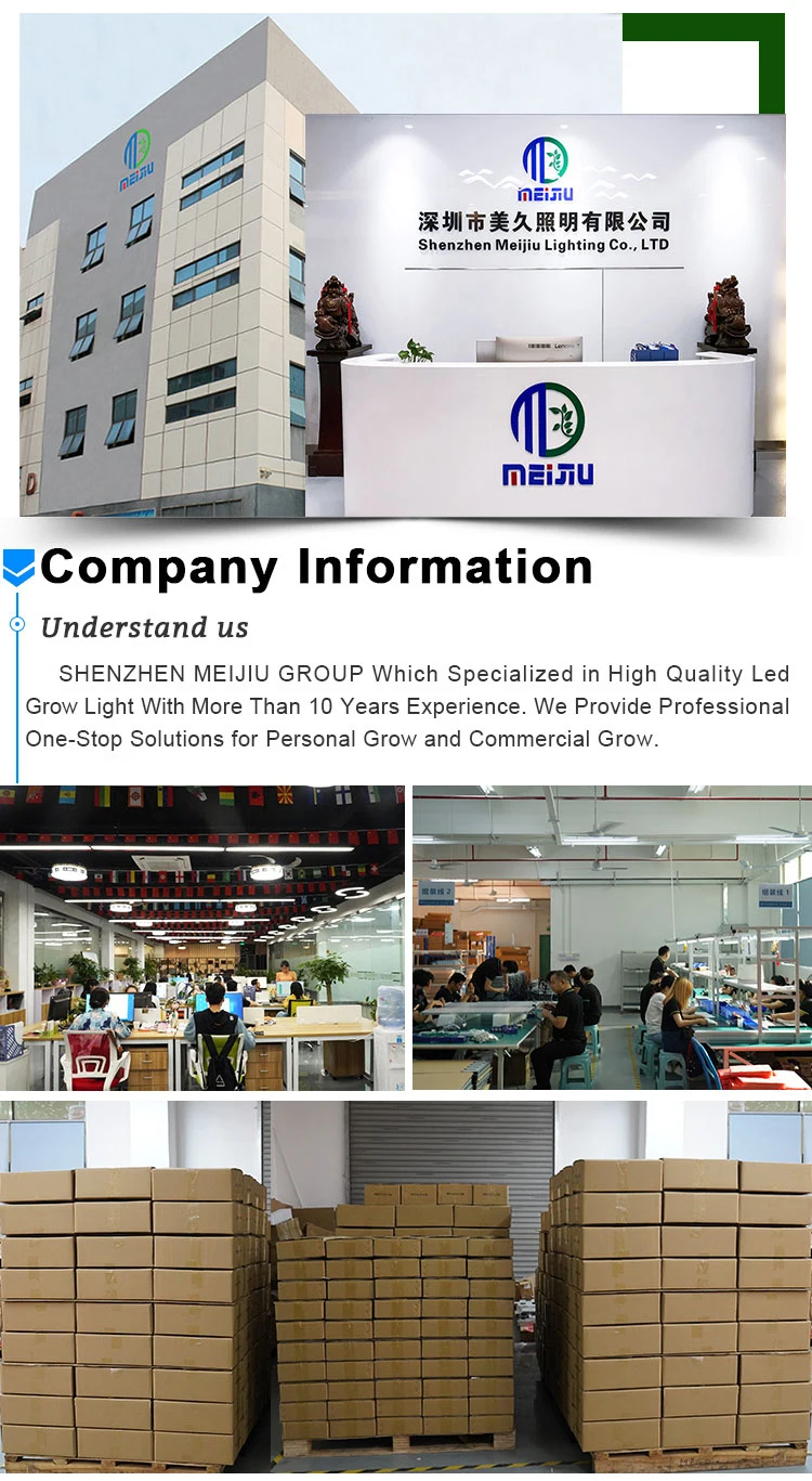 Shenzhen Meijiu lighting Co., Ltd established in 2010, is specializing in the production and sales of a wide range of led grow lights which provide one-stop service solutions. Our Main Products include led grow light, grow tent, Filter, Fans, Temperature and humidity detector, Planted barrels, and so on, our grow lights passed ETL, CE FCC certificate. Our products are popular in more than 200 countries such as North America and South America, and we are well known by many growers. Meijiu lighting own the professional engineers team, purchasing teams and sales team to supply you with better service, better quality and competitive prices.