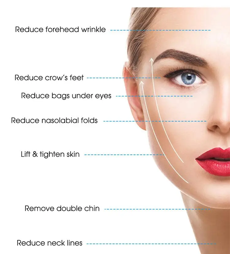 By transferring 60-65℃ energy waves to the epidermis, dermis and fascia layers of the skin, the skin tissue can produce fine and independent heat condensation points, activate the self-rebuilding ability of the skin, promote the regeneration and recombination of skin collagen and elastic fiber, and achieve the effect of layer by layer tightening and pulling.