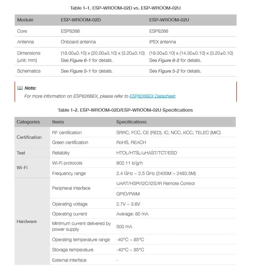 ESP-WROOM-02D and ESP-WROOM-02U are ESP8266EX-based modules developed by Espressif.