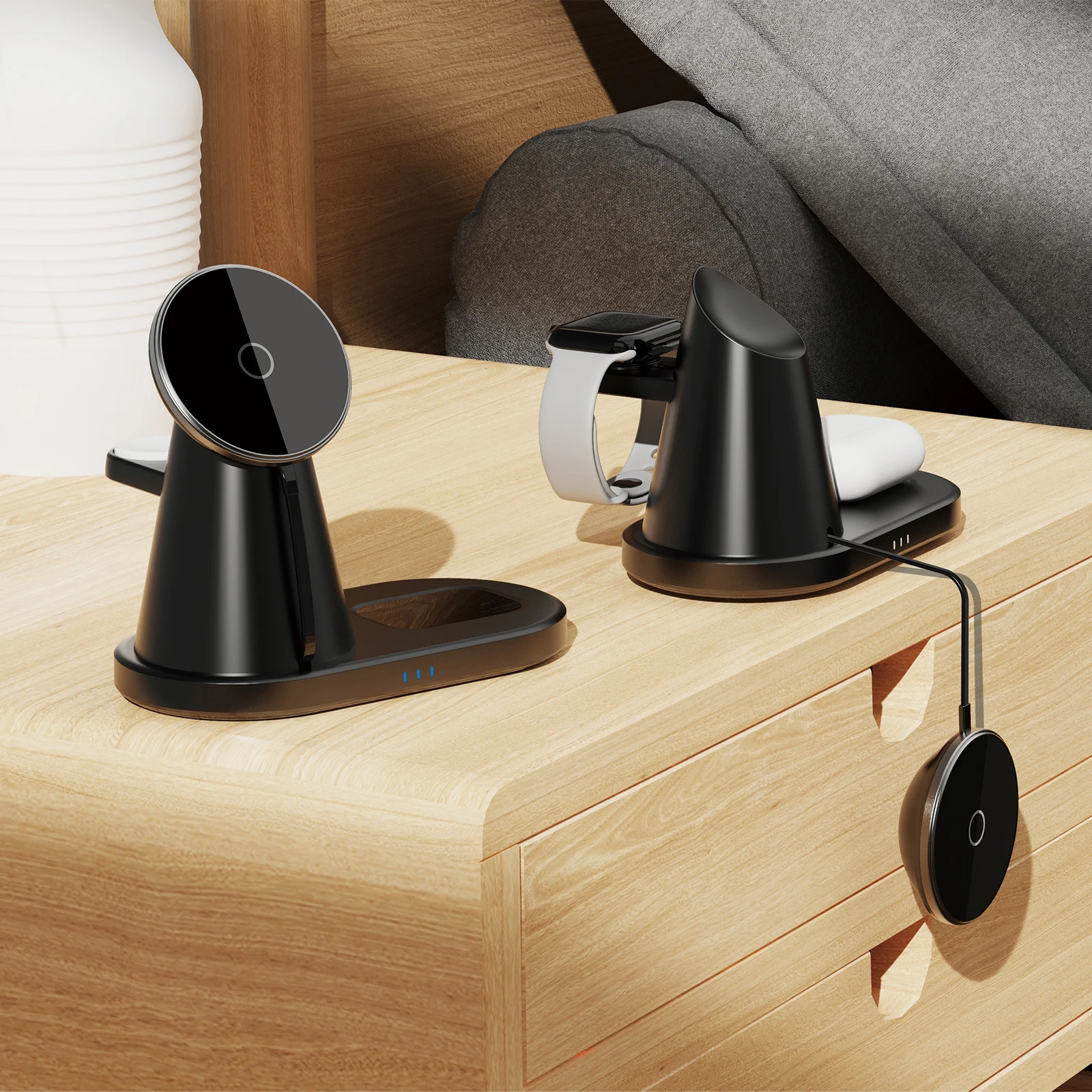 Features | •360° free rotation, view in any orientation for optimized access to charging, streaming, talking. •It can charge your phone, earphone and smart watches at the same time •Charger can be separated from the base with extend cable, convenient to play mobile phone while charging •Support PD&QC3.0 fast charger protocol •Support USB output, output 5V/2A •LED light indicator show charging status |