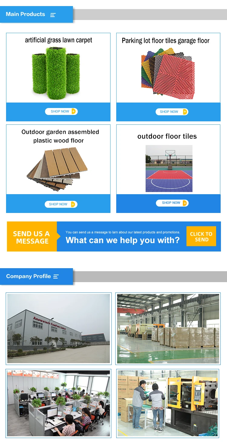 Our company has a complete production base, a central laboratory and a standard outdoor exhibition area. The main products include assembled suspended floors, garage floors, plastic-wood assembled floors, plastic elastic floors and customized artificial turf, etc., leading China with higher requirements and standards The leap-forward development of new outdoor flooring allows the new flooring products manufactured in Luoyang to go to the world with exquisite appearance and superior quality.