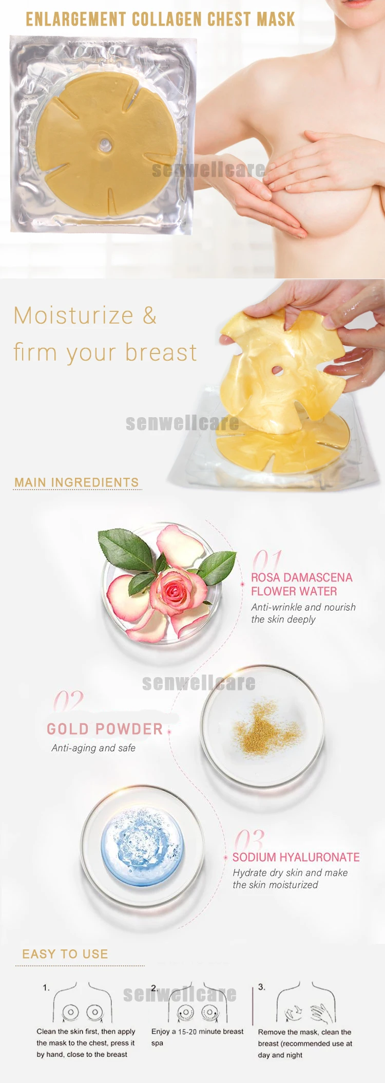 Private Label Plump Collagen Firming Sleeping Enlargement 24K Gold Crystal Breast Mask Sheet Collagen Breast Mask