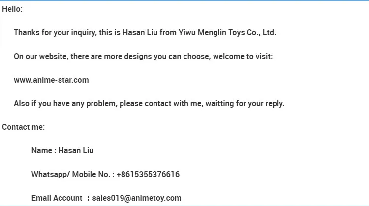 Yiwu MengLin Toys Co.,ltd is trade company Founded in July 2011, located in China of Yiwu International Trade City, we are one of biggest anime wholesalers in China, designing and producing various kinds of anime items with high quality, competitive price and superb service, And with an experienced and professional team, we have exported our products to many countries and regions all of the world.