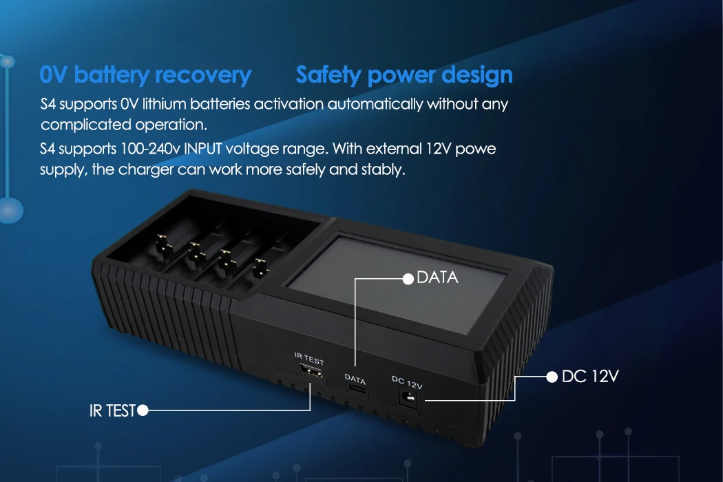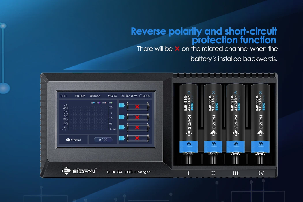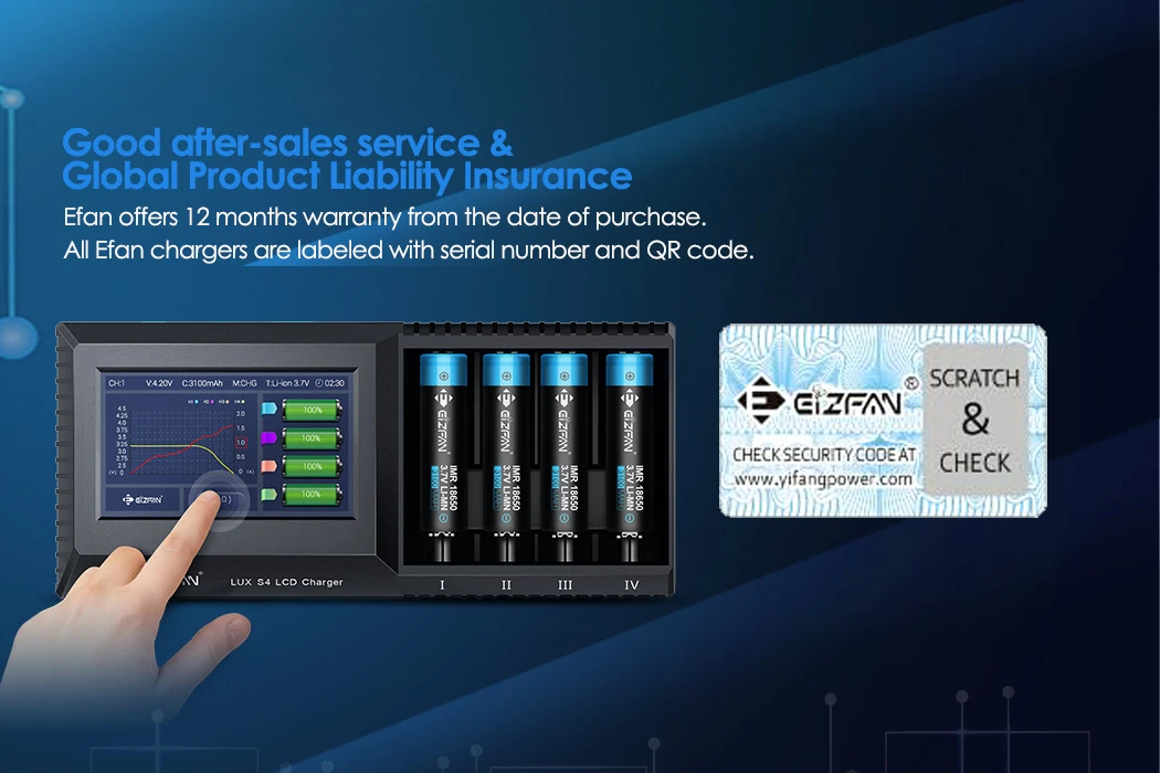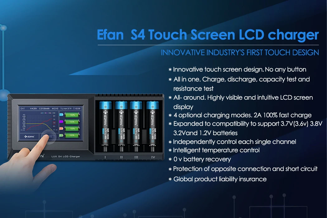 Efan S4 | Adapter | 0.5A*4 / 1A*4 / 1.5A*4 / 2A*4 | LCD | 3.6V / 3.7V / 1.2V / 3.2V / 3.8V | Test Capacity, Resistace/ Discharging / Touch Screen |