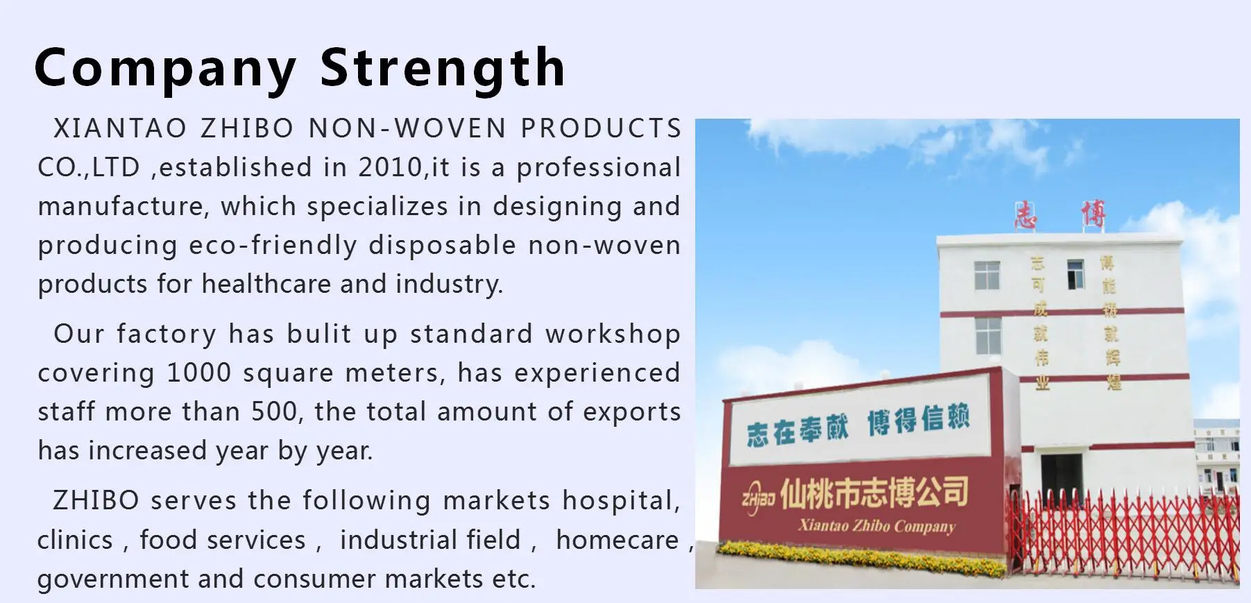 A: Zhibo company is focused on disposable protective wear 11+ years for every facet of the workplace from head to toe. The