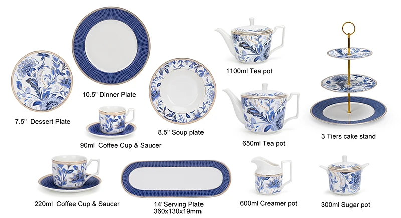 Measurement | 10.5'' Couple Plate 8.5'' Soup Plate 7.5'' Dessert Plate 14'' Serving Plate 220ml Cup & Saucer 90ml coffee & saucer |
