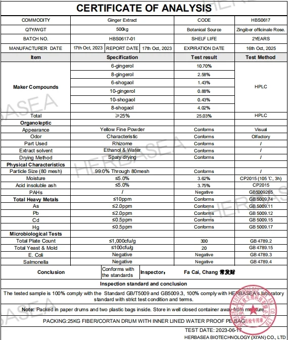Product Name: Ginger Extract Latin Name:Zingiber officinale Rosc. Parts Used: Root Active Ingredients:Gingerols,6-Gingerol, 6-Shogaol, 8-Gingerol, 10-Gingerol Specifications: Gingerols:10% 20% 25% by HPLC Appearance: Yellow Fine Powder