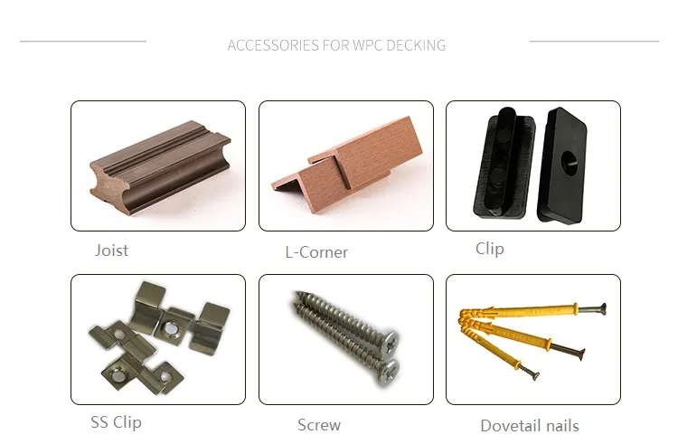 Decking accessories including : Joist, stainless steel clip or plastic clip ,nails, expansion screw, edge skirting .