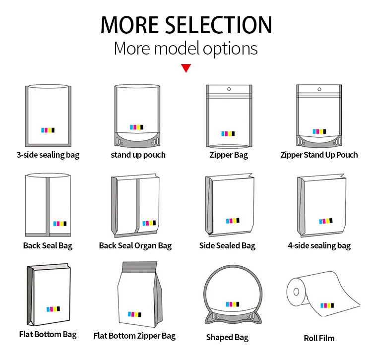 Bag types: | Stand up pouch, flat bottom bags, kraft paper bags, spout bags, aluminum foil bags, zip lock bags, middle sealing bags, three-side sealing bags, coffee & tea bags, commodity packaging bags etc. |