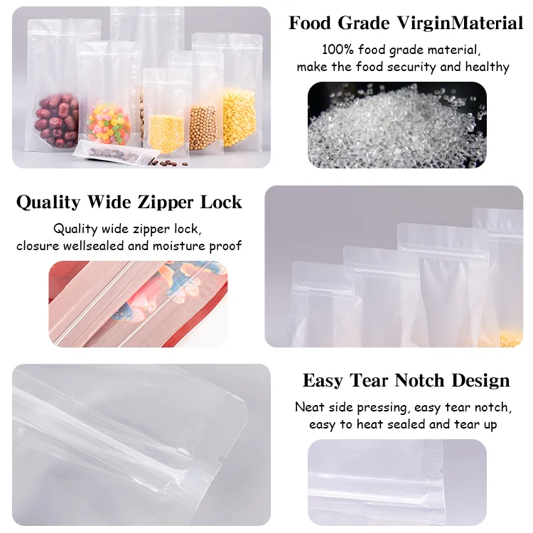Features: | * Stand Up, Zip Lock, Zipper Top, Moisture Proof, Strong Sealing, Clear Window; * Safety Food Grade Material & Ink, Eco-friendly Packaging; * New Material& Stable Quality; * Lightproof and Moisture Proof; * Reclose and Easy to Open; * Attractive Design; *China Customizable Bags Manufacture; |