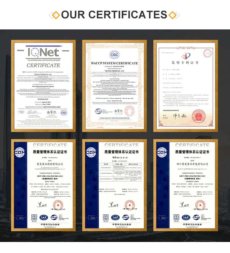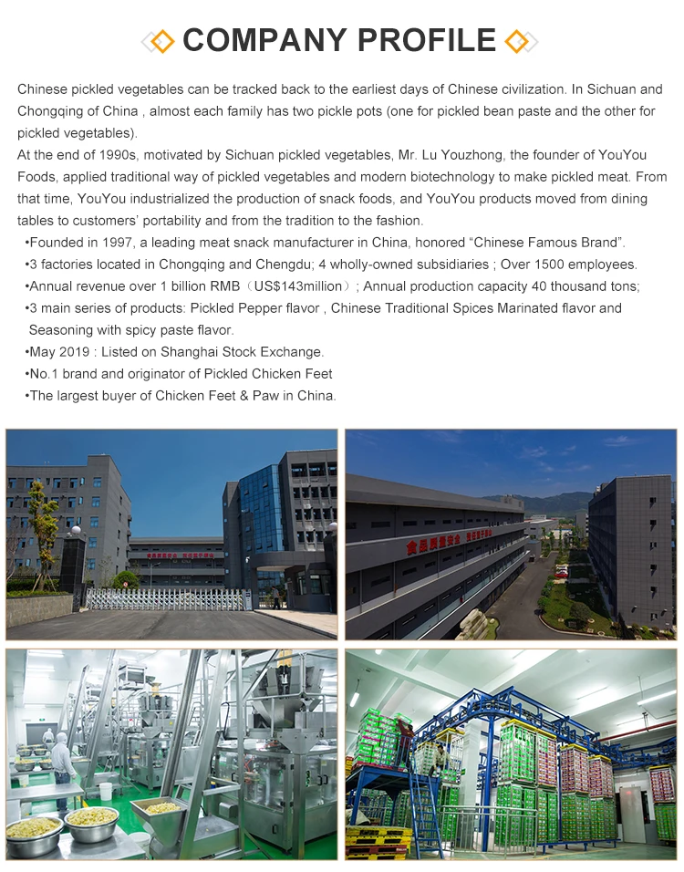 Chinese pickled vegetables can be tracked back to the earliest days of Chinese civilization. In Sichuan and Chongqing of China ,almost each family has two pickle pots (one for pickled bean paste and the other for pickled vegetables). At the end of 1990s,motivated by Sichuan pickled vegetables, Mr. Lu Youzhong, the founder of YouYou Foods, applied traditional way of pickled vegetables and modern biotechnology to make pickled meat. From that time, YouYou industrialized the production of snack foods, and YouYou products moved from dining tables to customers’ portability and from the tradition to the fashion.