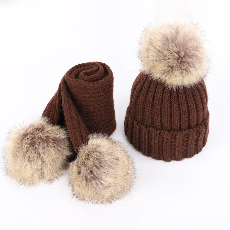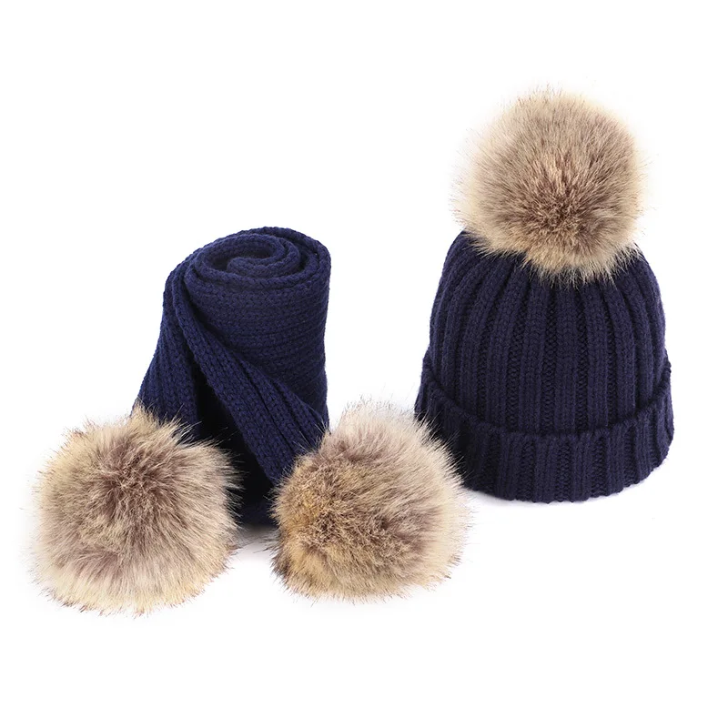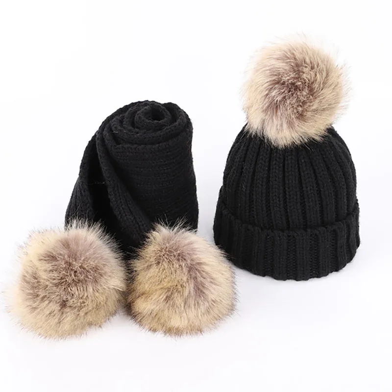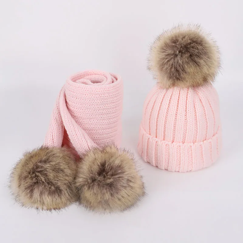 Детская вязаная шапка с помпоном зимние шапки и шарф набор из искусственного меха для мальчиков девочек