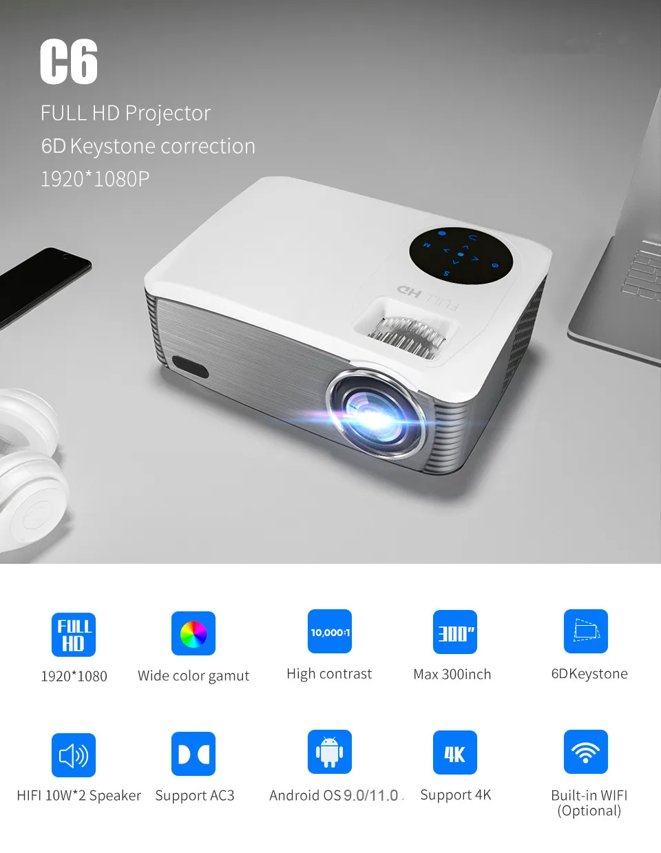 4) Horizontal+Vertical 6D Digital Keystone Correction±100º(for C6A) /±15º Vertical (for C6) Optional
