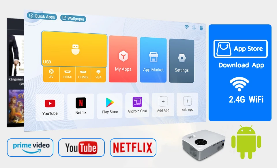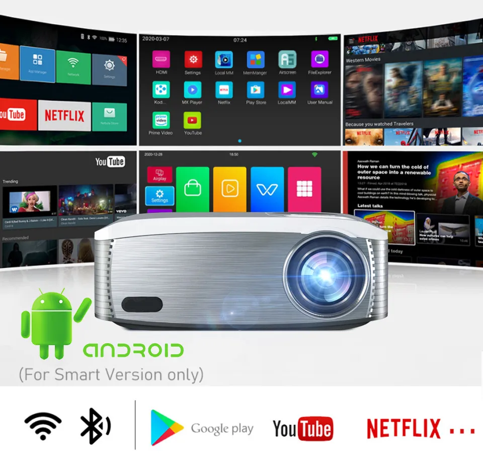 3. Equipped with Android 11.0 system, Bluetooth function, 6D automatic trapezoid, normal upgrade of NFLX, Amazon certified alexa English voice control, 5G dual-band WIFI, soft solution Dolby, support office office software, can play TV and video directly on the Internet.