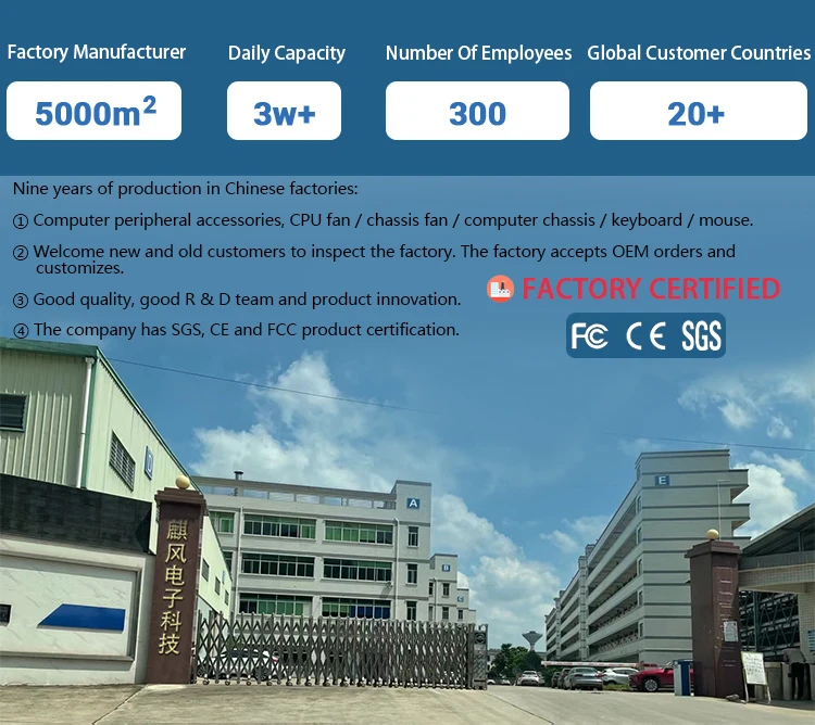 Dongguan Qifeng Electronic Technology Co., Ltd is a leading manufacturer and integrator of computer accessories. We are specialized in the design, research, development, production and sales of computer RGB fans, CPU cooler fans, computer case, keyboard and computer power supply. We have our owns SRHX brand which was founded in 2018 and located in Guangdong. Our products are also designed based the strict standard of the industry.