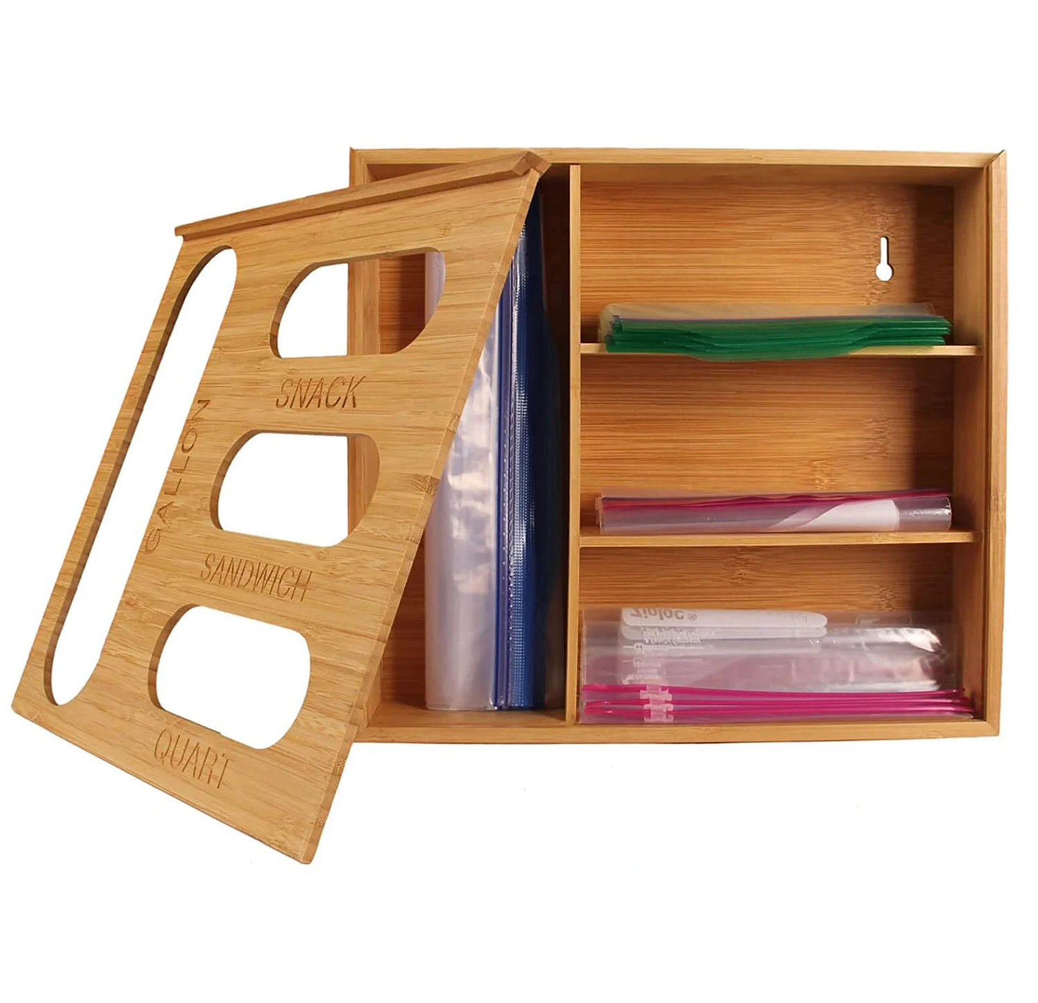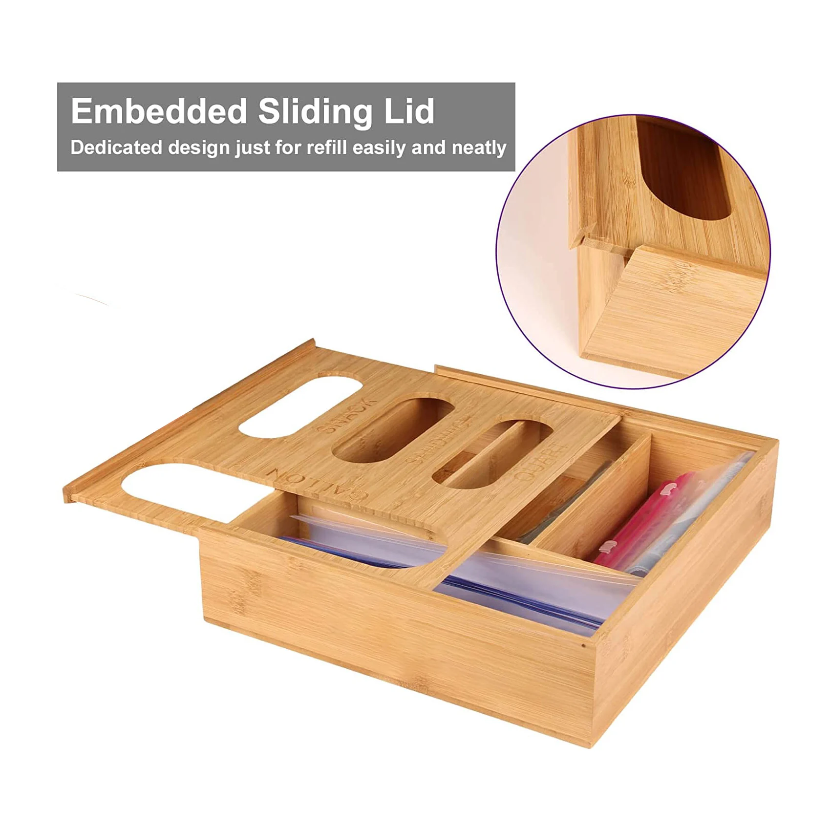 Production Descripiton : | Bamboo Ziplock Bag Storage Organizer for Drawer Laser Printing Ziploc Food Sandwich Storage Bag Organizer Holder |