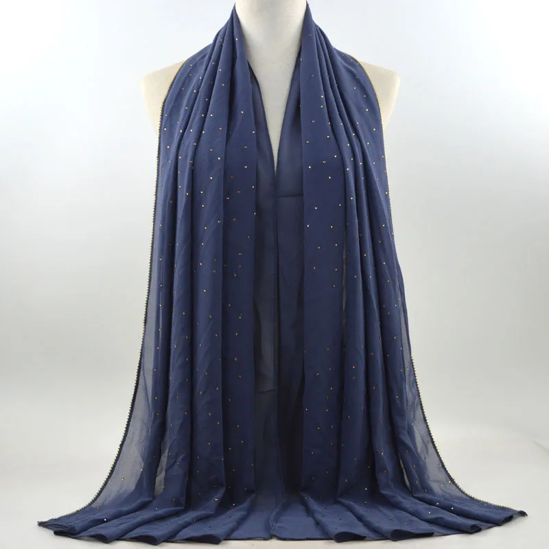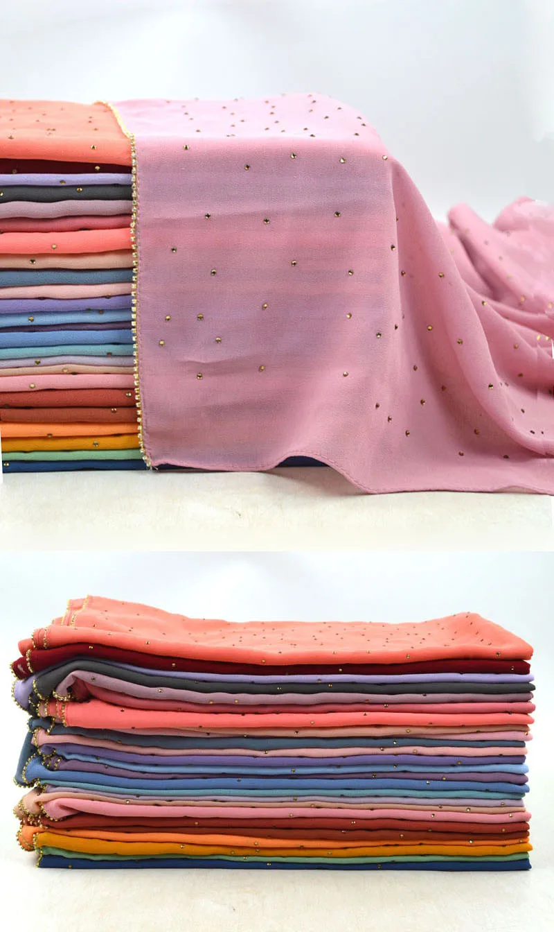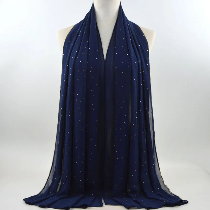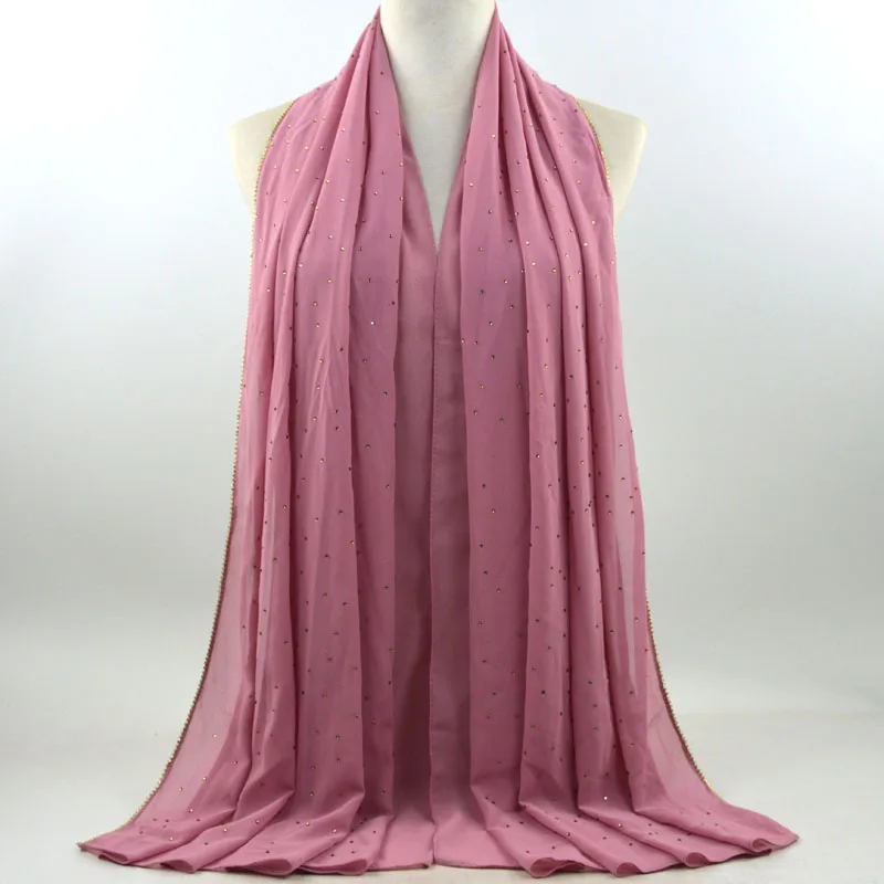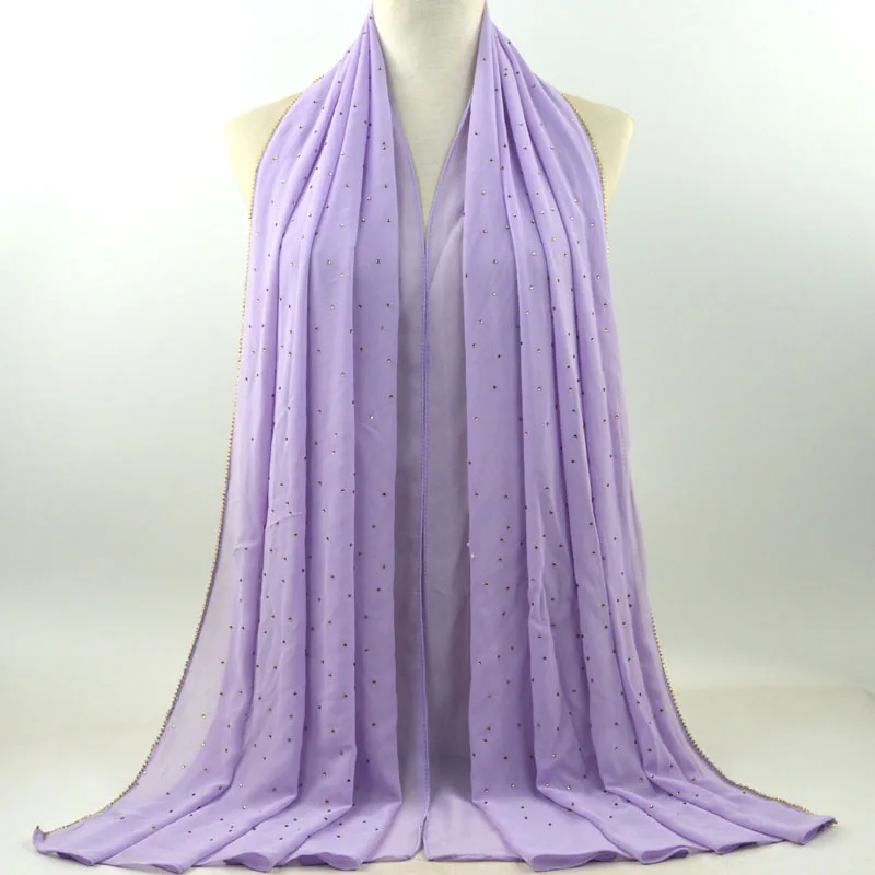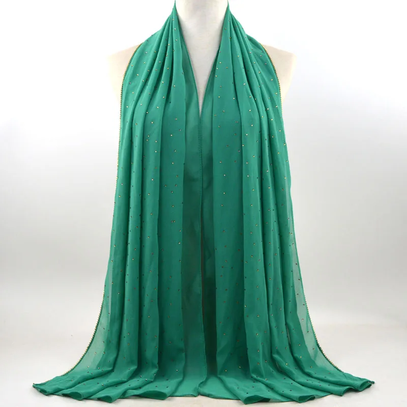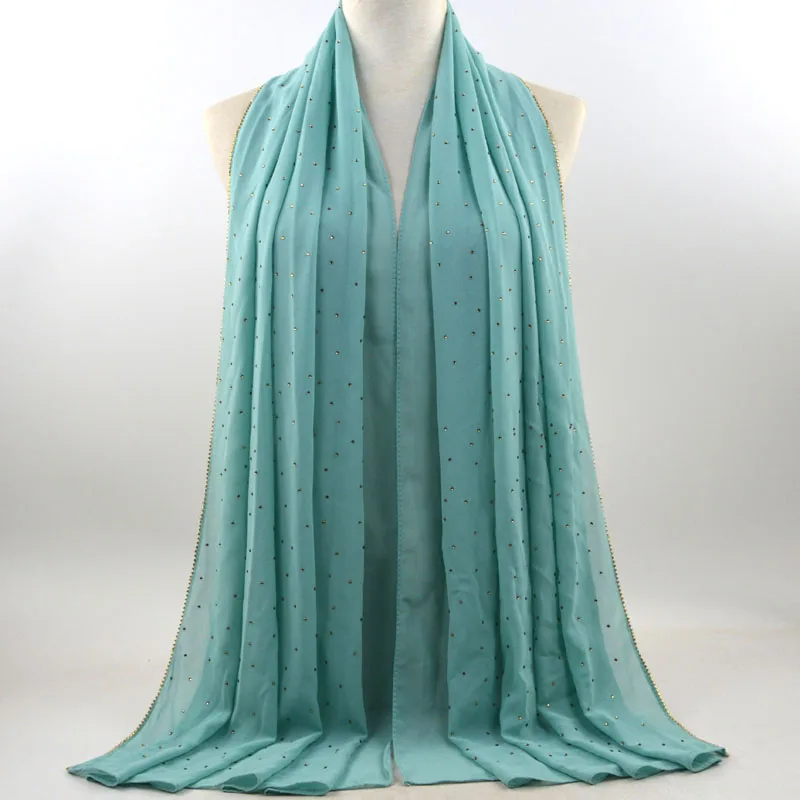 Plain Bubble Chiffon Hijab With Chain Diamond Glitter Rhinestone Muslim Long Head Wrap Shawl Scarves
