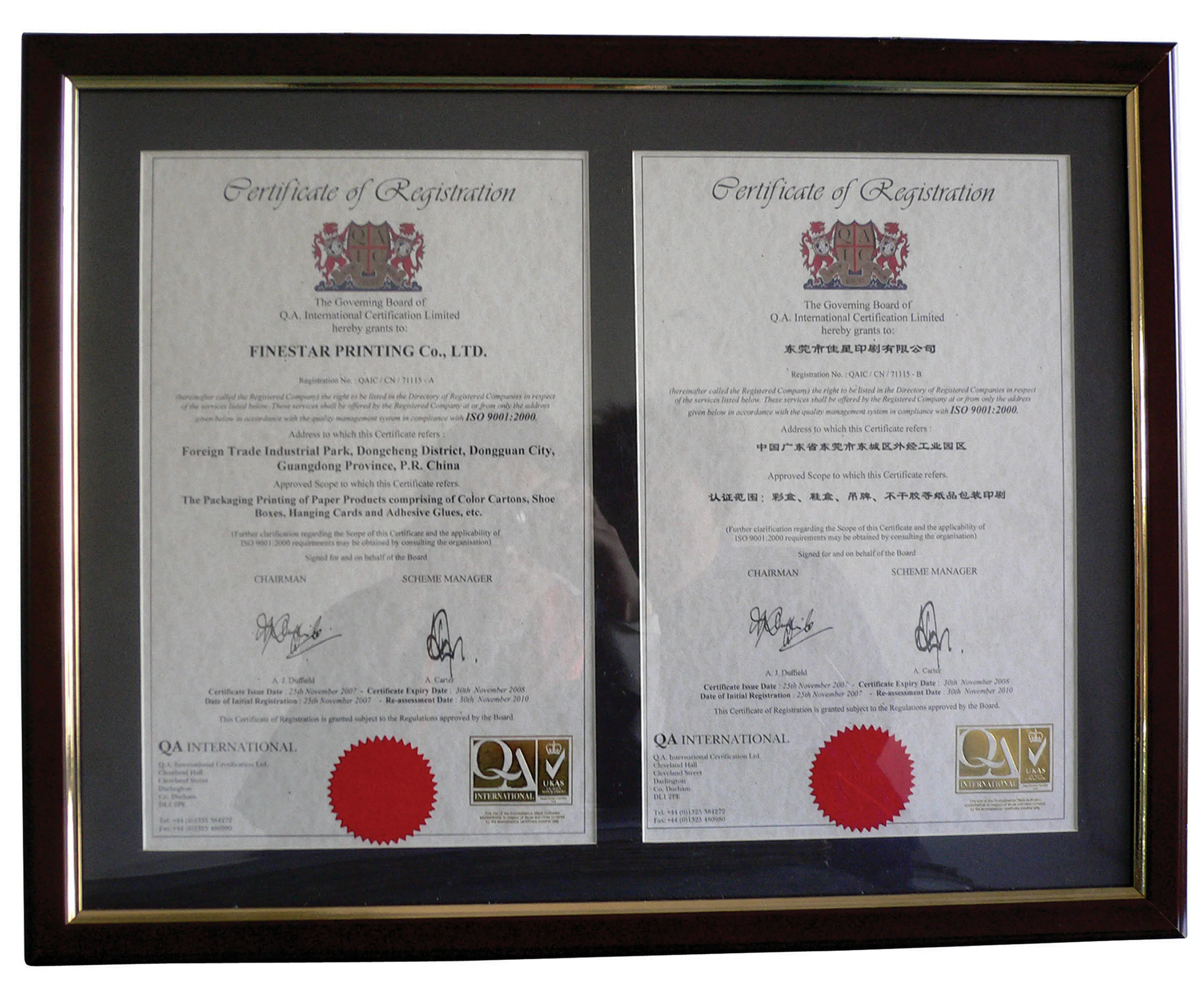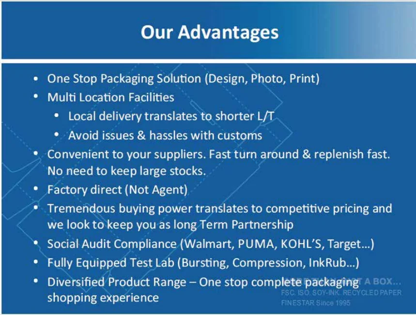 Dongguan Finestar Printing Co.,ltd , founded in 1995, is a large-scale paper printing and packaging enterprise. With 10000 square meters modern factory and over 300 skilled workers under management of some senior managers, the daily output can reach 500,000 pcs boxes. It carry out standard comprehensive qua -lity management system ISO9001:2000, and most of the workers in this career for over 15 years, make sure to produce good quality products for you. It owns advanced equipment, such as Komori 5-color printer, Roland 4- color printer, Roland 2- color printer, full-size printer, surface disposal machine, lamina -ting machine, automatic die-cutting machine, gluing machine, automatic rigid box machine and so on. From the beginning design to the final product making, all the process can do at the factory. Furthermore, colour photometer from USA, wear-resisting tester, temperature measuring device, barcode scanner,bursting strength tester make guarantee of your products quality. The main products is packaging and printing products, including sports accessories packing, electoronic products packing, gift boxes, stationery products and
