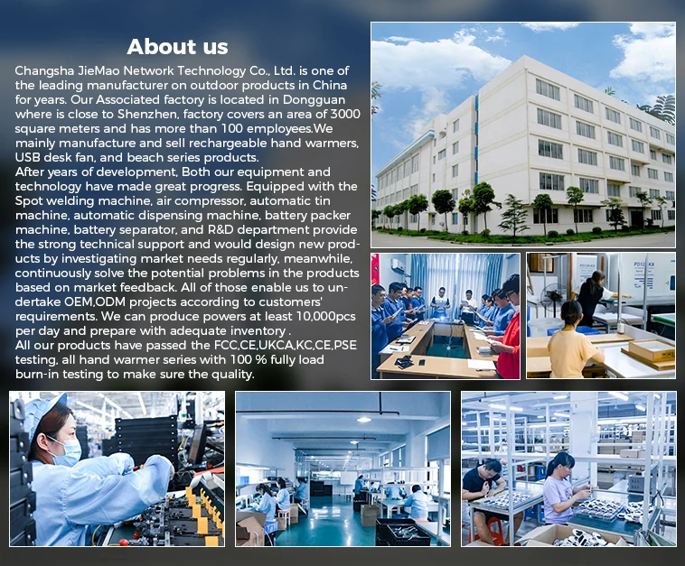 Changsha JieMao Network Technology Co., Ltd. is one of the leading manufacturer on outdoor products in China for years. Our Associated factory is located in Dongguan where is close to Shenzhen. Our factory covers an area of ​​4500 square meters and has more than 100 employees.We mainly manufacture and sell rechargeable hand warmers, USB desk fan, and beach series products. Especially for hand warmer.Our products are widely used for camping,Physical therapy, heat packs, heating, cooling,etc.