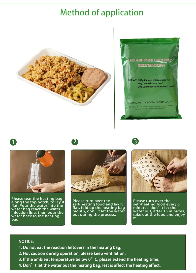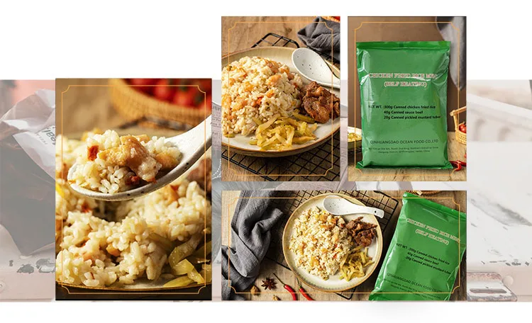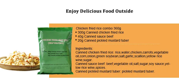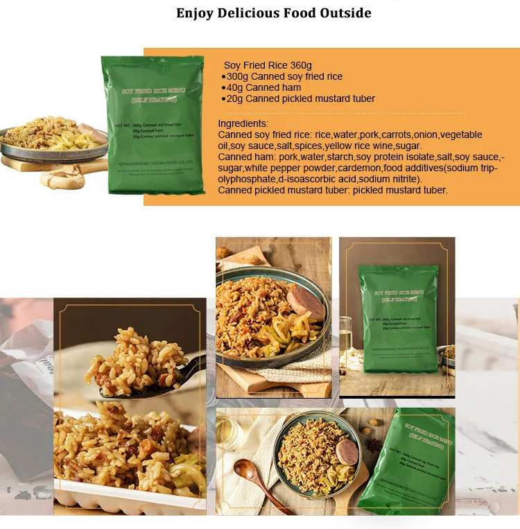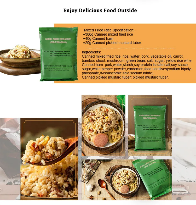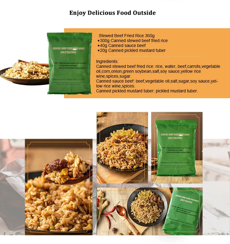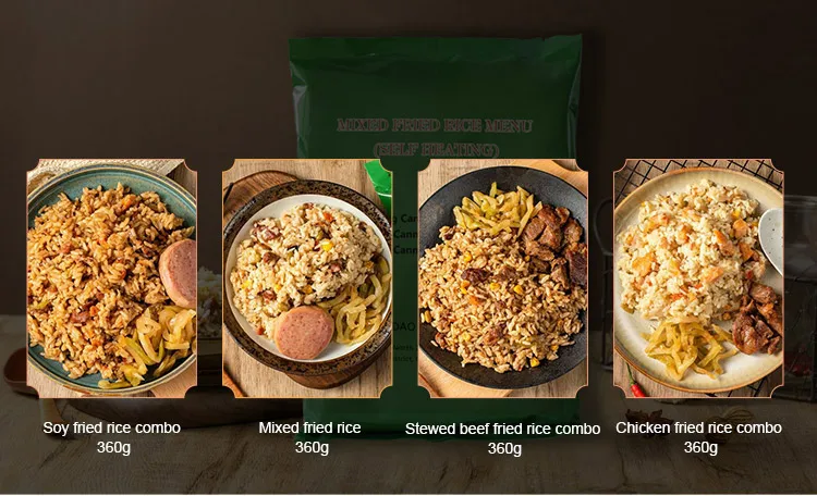 Description | 260g Sausage Fired Rice 100g Canned Pear 70g Sesame Seed Cake 40g Sauce Beef 4g*2 Fruit And Vegetable Fiber Chewable Tablets 1.5g*2 Chewing Gum 20g Pickled Mustard Tuber | 240g Tai Huang Seafood Fried Rice 240g Mushroom Stewed Pork Fried Noodles 20g Mushroom Paste 20g Spicy Cabbage 4g*2 Fruit And Vegetable Fiber Chewable Tablets 1.5g*2 Chewing Gum | 260g Curry Fried Rice With Seafood 200g Stewed Beef Fried Noodles 50g Fish Cake 10g Instant Powder Drinks 3g Chewing Gum 25g Chocolate 20g Chili Oil Flammulina Veltuipes | 260g White Noodles 100g Mushroom With Minced Meat 50g Sauce Beef 30g Energy Bar 10g Instant Power Drinks 3g Chewing Gum 25g Chololate 20g Sweet Crisp Cucumber |