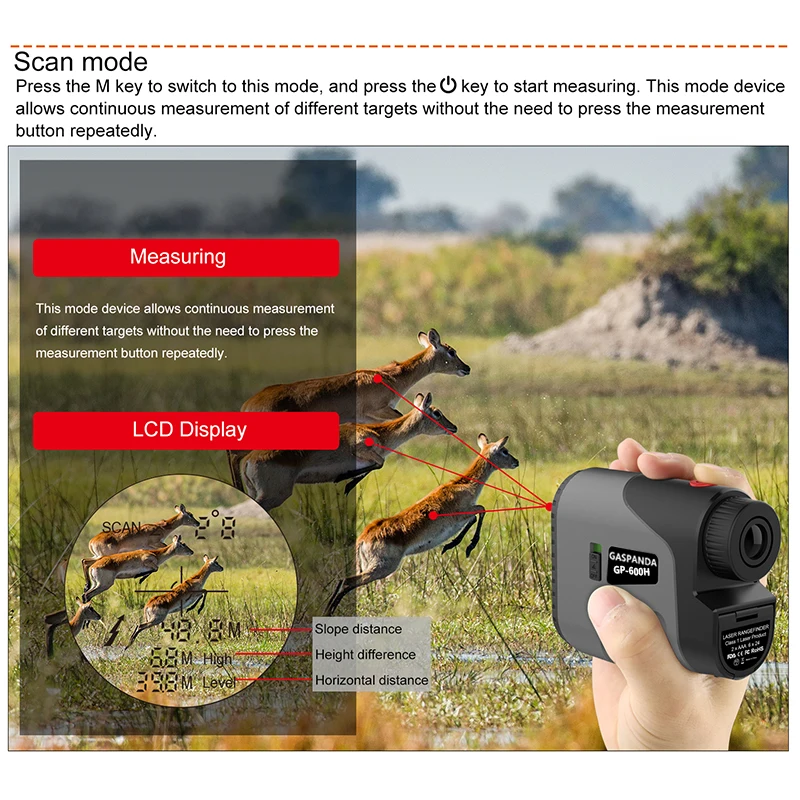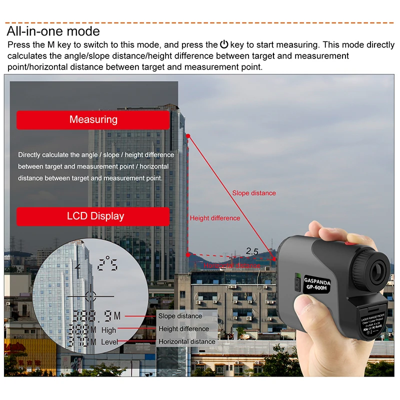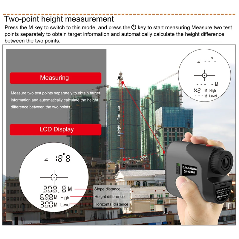 Two-point height measurement mode (measure the height difference between two points) | Have | Speed measurement mode (measure the speed of an object) | Have | ||||