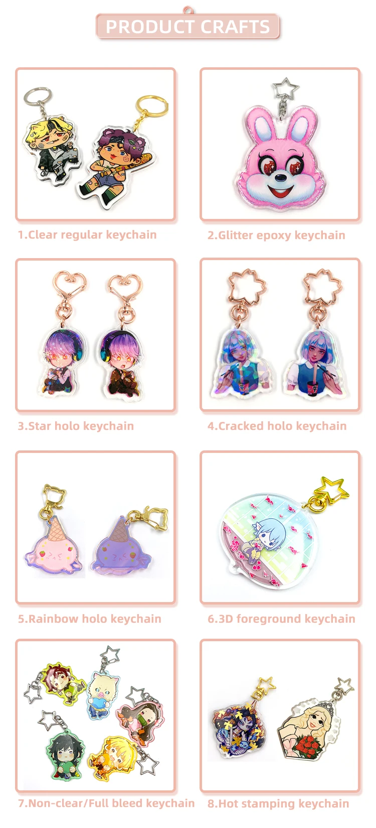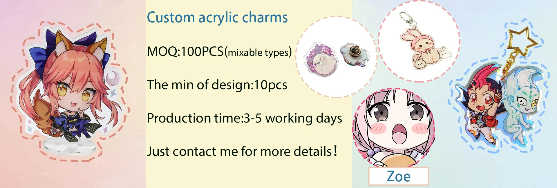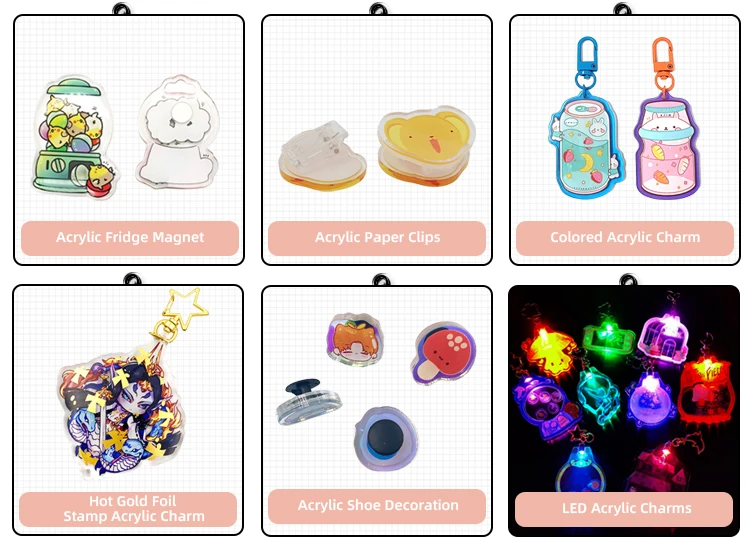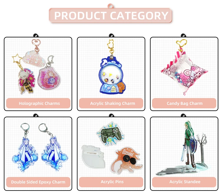 We are specialized in producing acrylic products: Epoxy Charms, Candy Charms, Shaking Charms, 3D Charms, Acrylic Standee, Acrylic Pins and so on.
