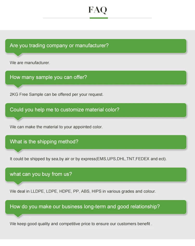 We Strive to provide high quality products and flexible service for local and global customers, strive to become the world's first-class supplier of polypropylene particles. Our products are PLA PET LLDPE LDPE ABS PVC EVA PE TPE and other raw materials, . The company has experienced technical personnel, well-trained staff . we insist to the "quality proves strength, details decide success" business philosophy. We adhere to the "quality, efficiency, integrity, pragmatic" development policy, to provide you with quality processing services! We sincerely welcome you to visit our company or contact us for cooperation!