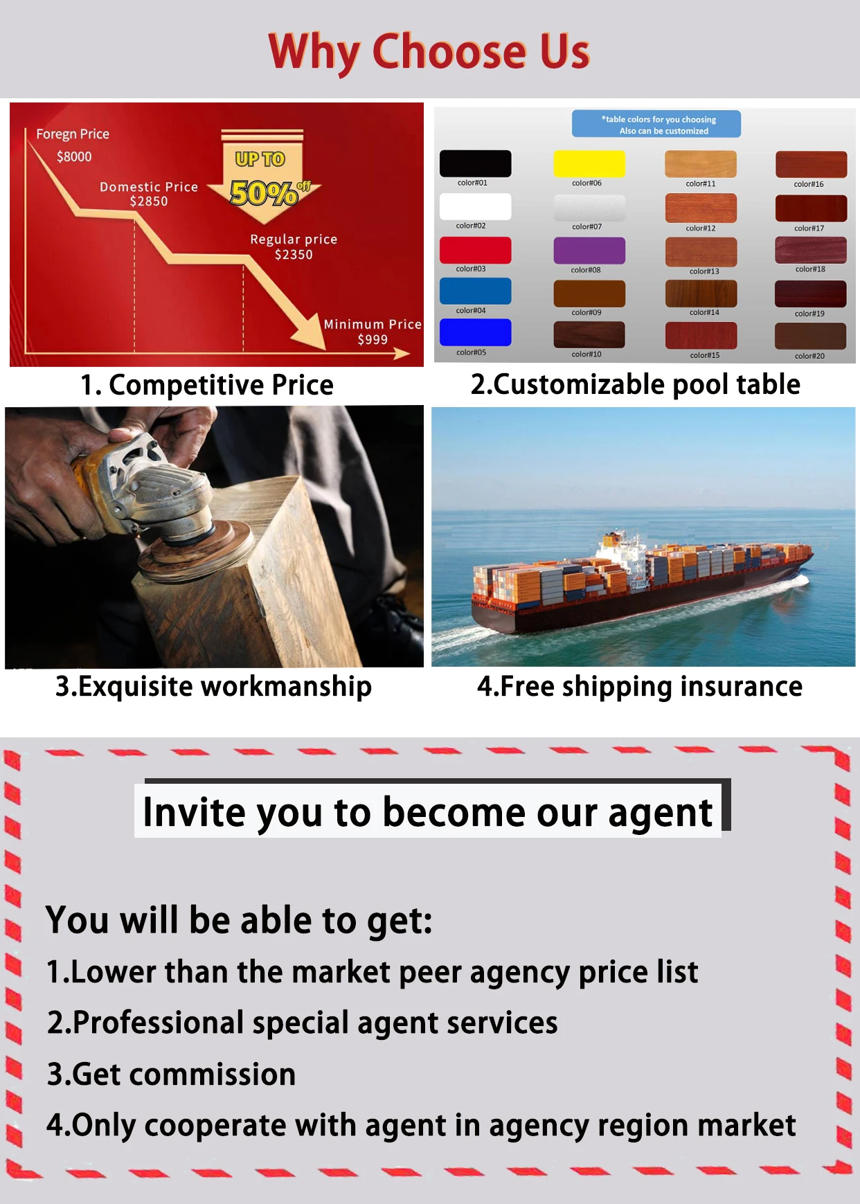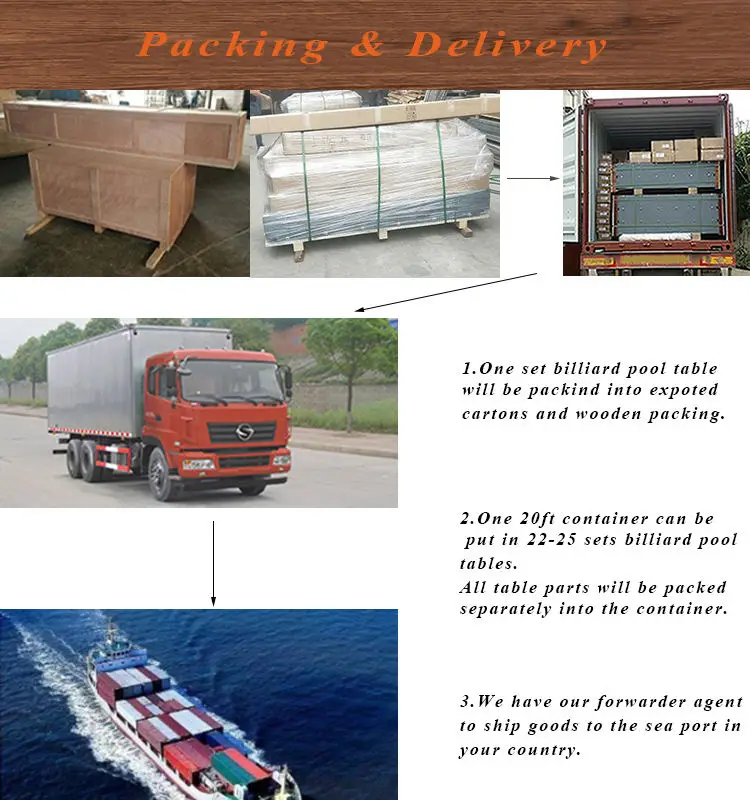 Free Accessories | 1box Aramith billiard balls,4pcs handmade billiard cues,1set fast speed billiard cloth,1box chalks,1box cue tips,1pc triangle,1pc cue rack,1pc cross rest head with stick,1pc brush,1pc table cover,4pcs professional gloves,1set installation tools | ||||||