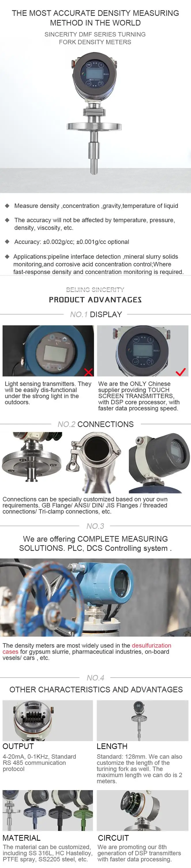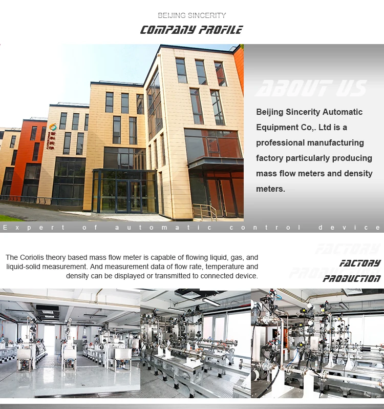 Sincerity DMF Series is a twin bent tube design for process industries that demand high performance as standard. Beijing Sincerity is the research and development center of excellence for coriolis mass flow meter technology. Each production area specializes in a particular aspect of assembly. This forcus on expertise drives quality and continuous improvement. Our calibration laboratory is China certified to provide approved traceability. Every mass flow meter undergoes stringent tests to guarantee precise and repeatable performance. Repeatable performance research and development has played a crucial role in shaping the evolution of the DMF series mass flow meters. Customer support is every bit as good as the products with practical advice training and aftercare available from our extensive support network. Sincerity DMF Series mass flow meter can operate down to cryogenic temperature as low as minus 250 degree celsius, and up to high temperatures of 400 degree celsius.