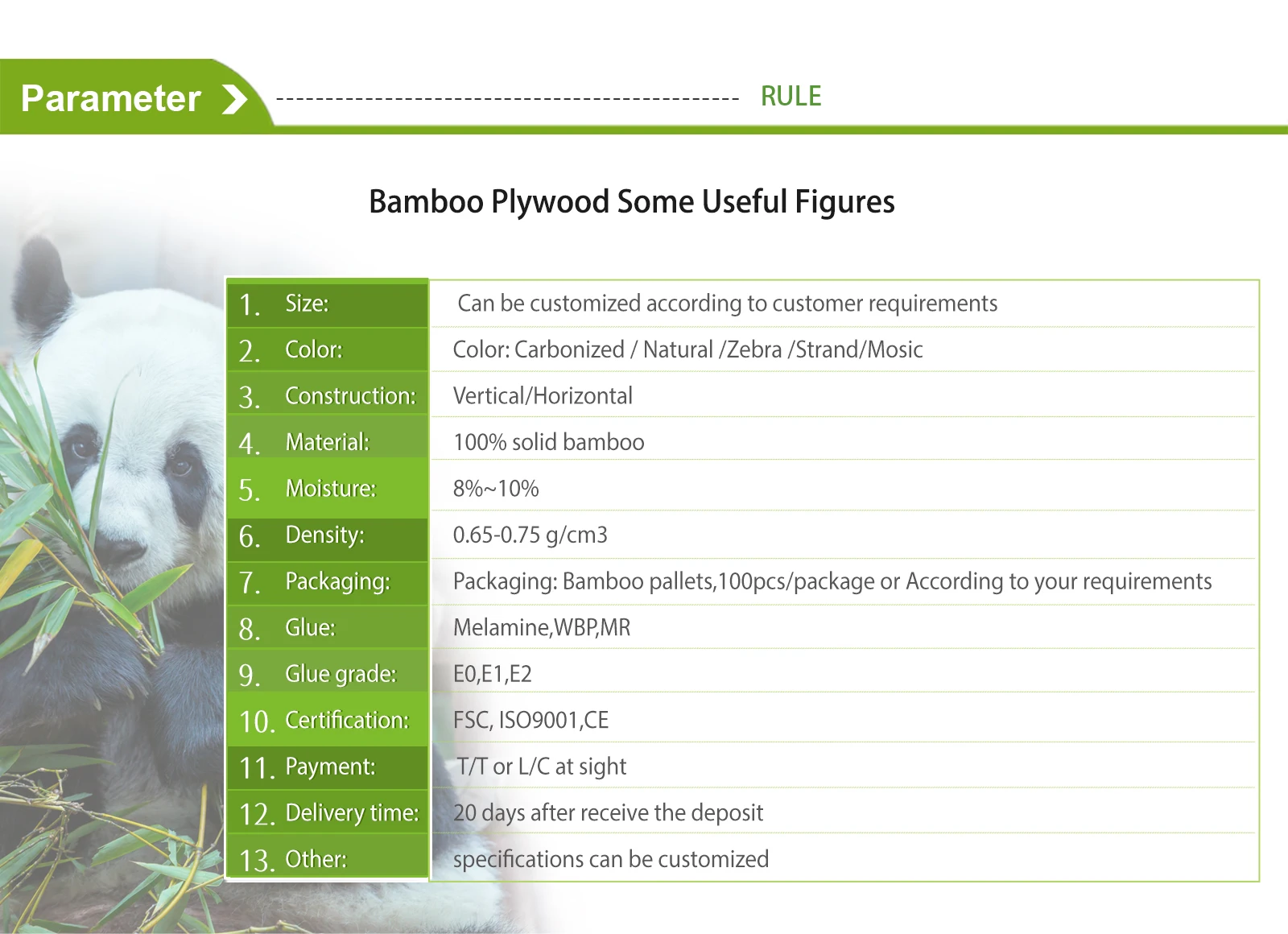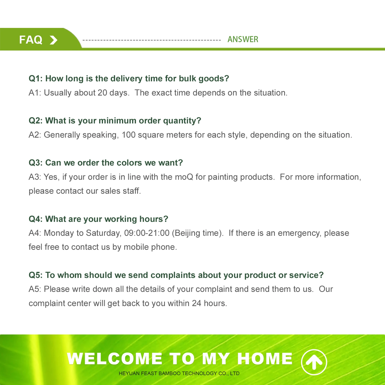 Heyuan Feast Bamboo Technology Co., Ltd. was established in 2005, specializing in the production of various bamboo boards, heavy bamboo boards, bamboo flooring, bamboo footline, decorative bamboo lines. At present, the factory covers an area of more than 23,000 square meters, with 4 advanced production lines and more than 100 skilled workers.The company takes ISO9001 quality management system as its quality management policy and adopts E0 grade soybean glue in line with European standard.