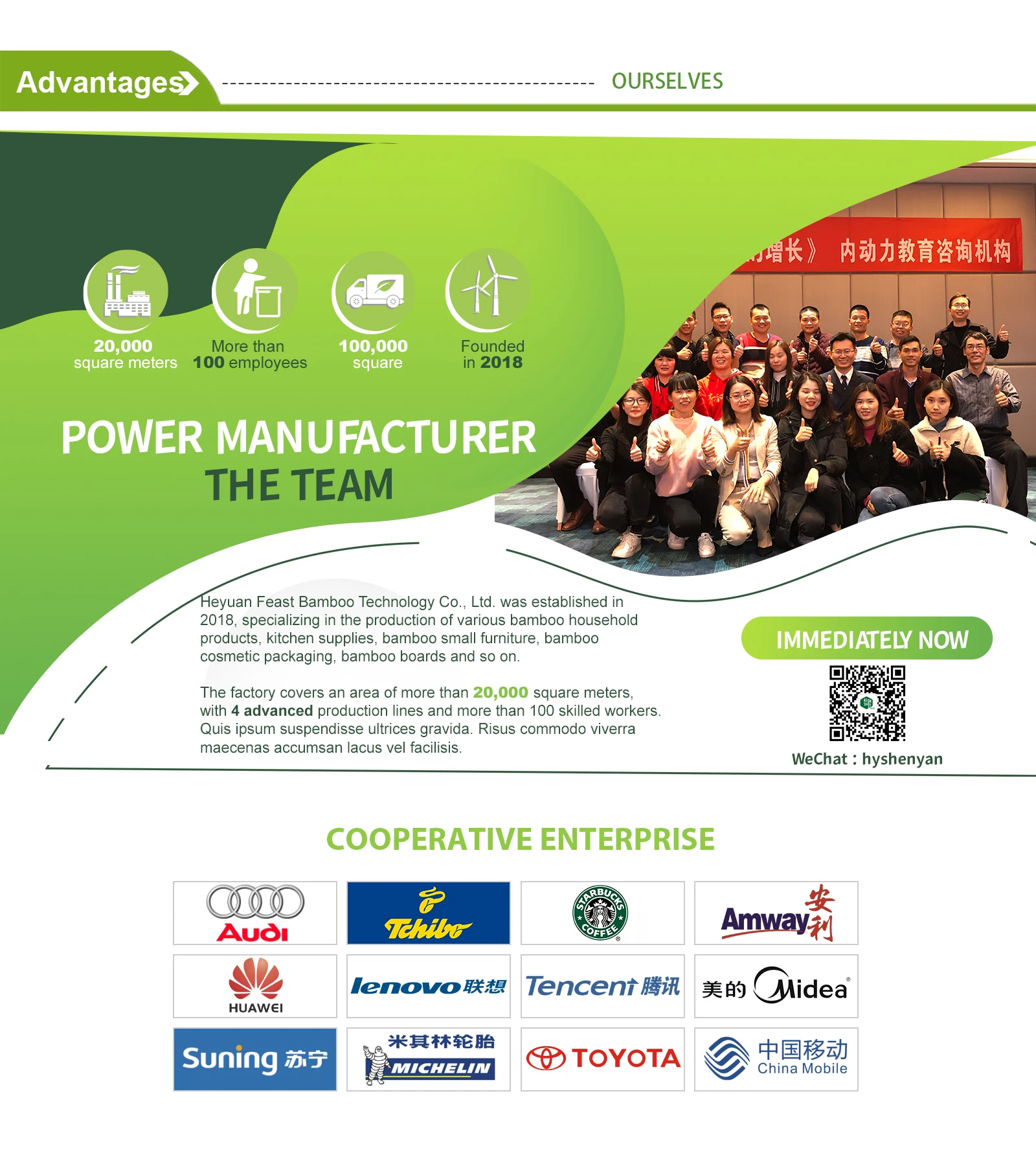 Our company committed to condense a group, which is with the following core values -- "To amend heart, to forge ahead, to innovate, to be benefited". Adhere to "based on bamboo industry, promoting the value of bamboo, promote the development of bamboo" as the enterprise mission, to achieve the desired of "Use more bamboo products, cut down one less tree, rebuild the eco-friendly environment, let bamboo elements get into everyone's life and bring us good vision!"