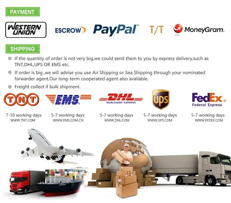A: Alibaba Trade Assurance, TT,L/C.PAYPAL,Western Union,if necessary,please contact us for negotiation.