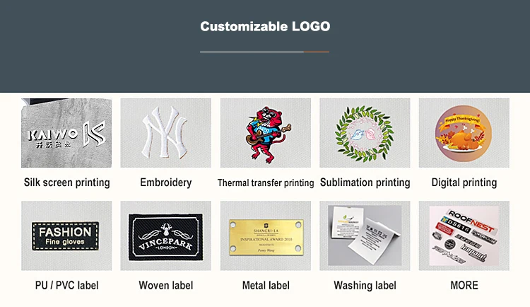 A: Metal logo, woven label,printing, rubber sticker,PU label, sublimation printing.