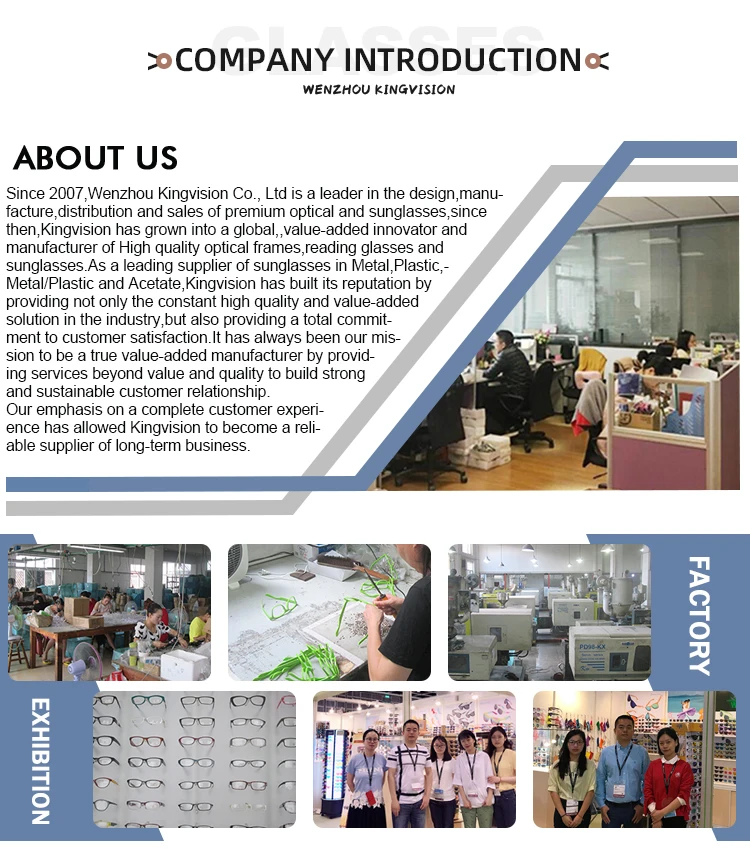 Since 2007,Wenzhou Kingvision Co., Ltd is a leader in the design,manufacture,distribution and sales of premium optical and sunglasses,since then,Kingvision has grown into a global,,value-added innovator and manufacturer of High quality optical frames,reading glasses and sunglasses.As a leading supplier of sunglasses in Metal,Plastic,Metal/Plastic and Acetate,Kingvision has built its reputation by providing not only the constant high quality and value-added solution in the industry,but also